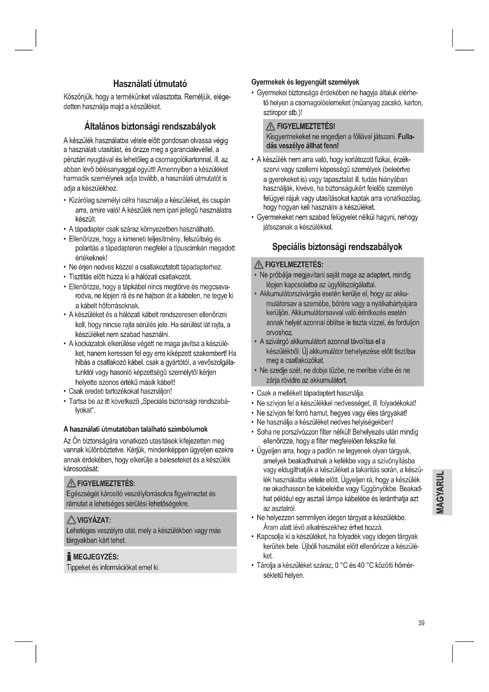 - Gyermekeket nem szabad felügyelet nélkül hagyni, nehogy játsszanak a készülékkel. Speciális biztonsági rendszabályok FIGYELMEZTETÉS: