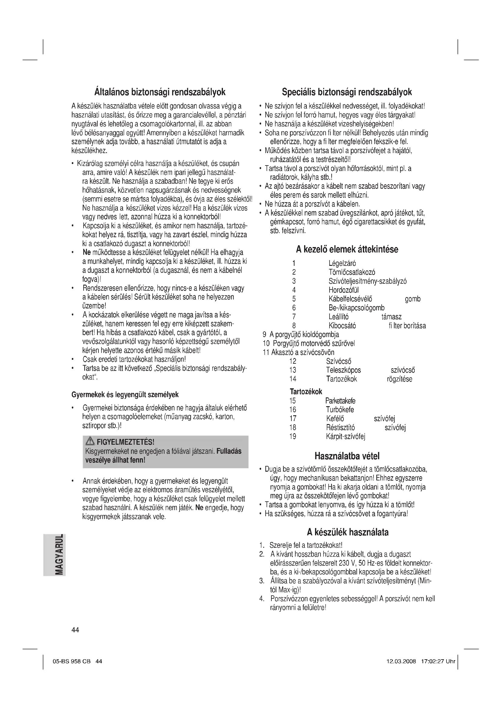 - A készülék nem szív. Lehetséges ok: A portartály vagy a szűrő szennyezett. Megoldás: Ürítse ki ill. tisztítsa meg a részeket. 05-BS 958 CB 4605-BS 958 CB 46 12.03.2008 17:02:28 Uhr12.03.2008 17:02:28 Uhr47 MAGYARUL MAGYARUL Lehetséges ok: A szívócsőbe vagy a fúvókába valami beszorult. Megoldás: Ellenőrizze, hogy nem szorult-e be valami a tartozékba. Műszaki adatok Modell: ..........................................................................BS 958 CB Feszültségellátás: .........................................220-240 V, 50/60 Hz Teljesítményfelvétel: