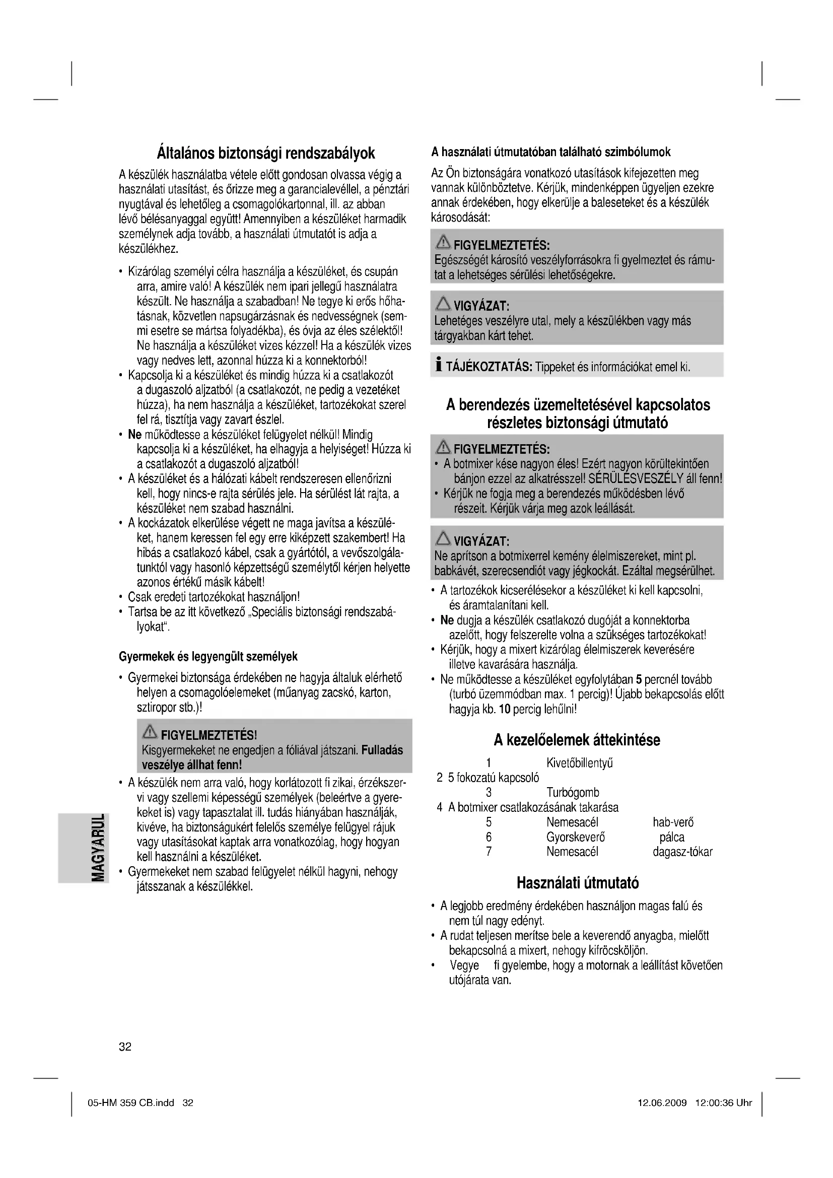 - Kérjük hagyományos módszerrel mossa le a berendezést. Műszaki adatok Modell: .........................................................................HM 359 CB Feszültségellátás: ................................................ 230 V, Teljesítményfelvétel: ............................................................ 250 W Védelmi osztály: .......................................................................... ΙΙ Rövid üzemeltetési idő: ........................................................5 perc Turbó-üzemmód: ..................................................................1 perc Nettó súly: ..........................................................................1,40 kg 05-HM 359 CB.indd 3305-HM 359 CB.indd 33 12.06.2009 12:00:36 Uhr12.06.2009 12:00:36 Uhr 50/60 Hz34 MAGYARUL MAGYARUL Ezt a készüléket az Európa Tanács minden vonatkozó aktuális irányelve szerint (pl. elektromágnesesség-elviselő képesség vagy kisfeszültség-elviselő képesség) ellenőriztük, és a legújabb biztonságtechnikai előírások szerint készült. A műszaki változtatások jogát fenntartjuk. A „kuka“ piktogram jelentése Kímélje környezetünket, az elektromos készülékek nem a háztartási szemétbe valók! Használja az elektromos készülékek ártalmatlanítására kijelölt gyűjtőhelyeket, ott adja le azokat az elektromos készülékeit, amelyeket többé már nem kíván használni! Ezzel segítséget nyújt ahhoz, hogy elkerülhetők legyenek azok a hatások, amelyeket a helytelen „szemétre dobás“ gyakorolhat a környezetre és az emberi egészségre. Ezzel hozzájárul az újrahasznosításhoz, a recyclinghoz és a kiöregedett elektromos és elektronikus készülékek értékesítésé- nek egyéb formáihoz. Az önkormányzatoknál vagy a polgármesteri hivatalokban tájékoztatást kaphat arról, hogy hova viheti a kiselejtezett készülékeket. 05-HM 359 CB.indd 3405-HM 359 CB.indd 34 12.06.2009 12:00:37 Uhr12.06.2009 12:00:37 Uhr35
