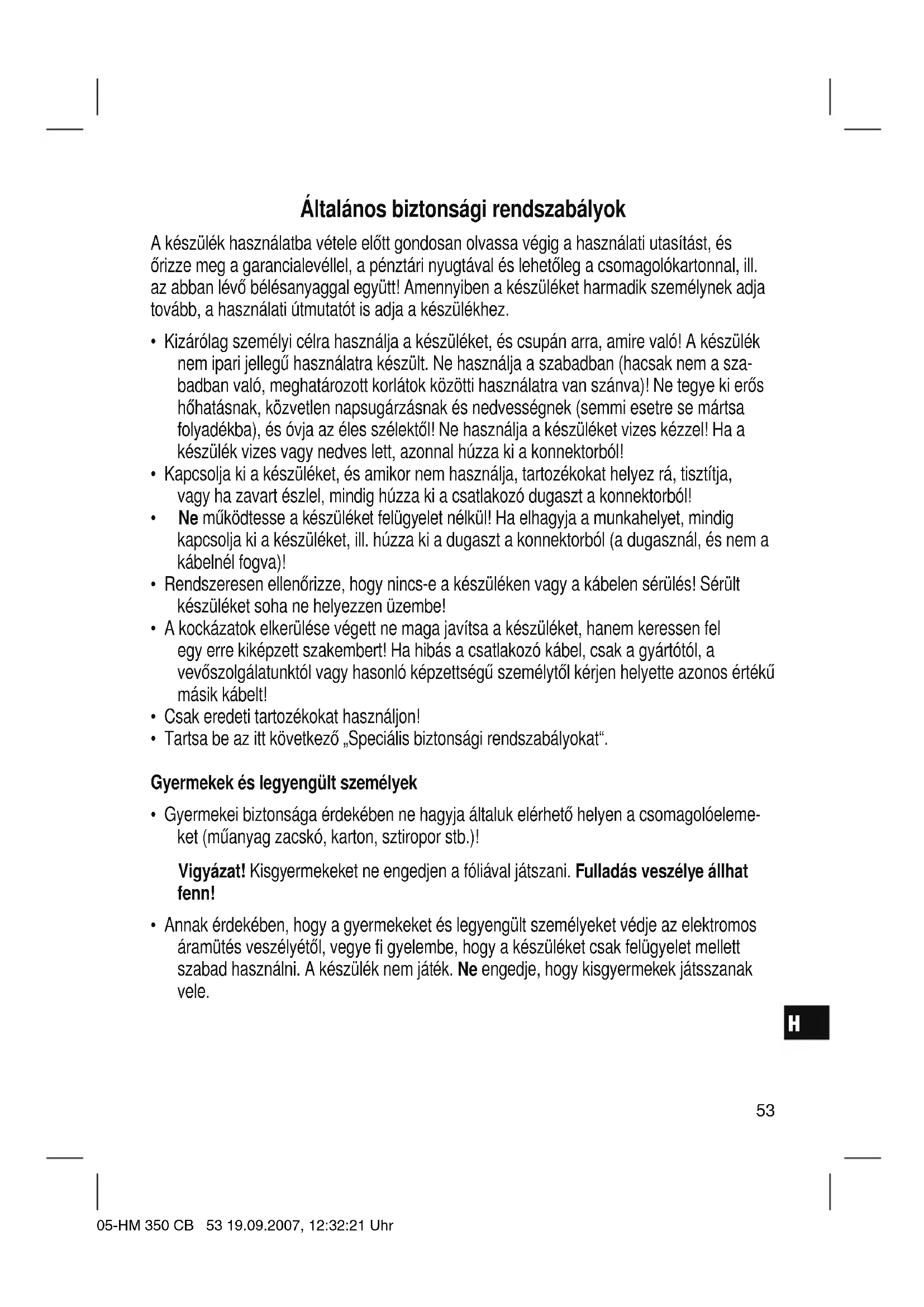 - Annak érdekében, hogy a gyermekeket és legyengült személyeket védje az elektromos áramütés veszélyétől, vegye fi gyelembe, hogy a készüléket csak felügyelet mellett szabad használni. A készülék nem játék. Ne engedje, hogy kisgyermekek játsszanak vele. 05-HM 350 CB 53 19.09.2007, 12:32:21 UhrH