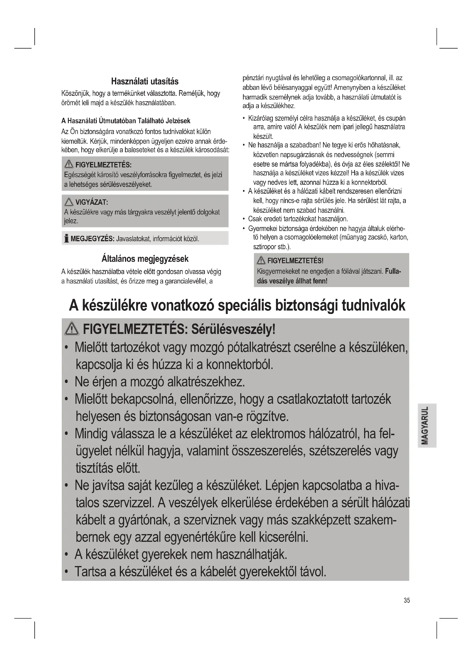 - Gyermekei biztonsága érdekében ne hagyja általuk elérhe- tő helyen a csomagolóelemeket (műanyag zacskó, karton, sztiropor stb.). FIGYELMEZTETÉS! Kisgyermekeket ne engedjen a fóliával játszani. Fulla- dás veszélye állhat fenn! A készülékre vonatkozó speciális biztonsági tudnivalók FIGYELMEZTETÉS: Sérülésveszély!