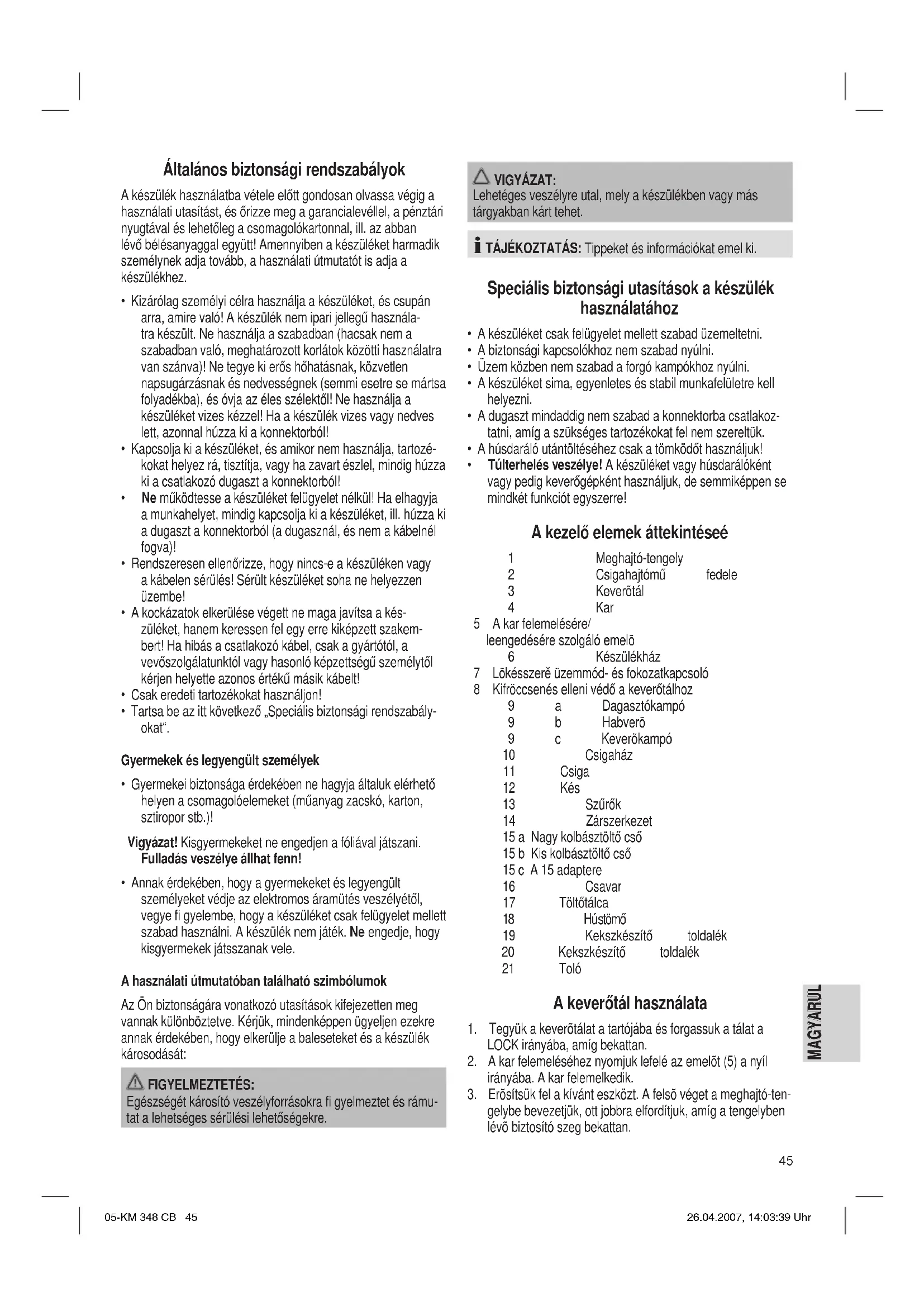 - Túlterhelés veszélye! A készüléket vagy húsdarálóként vagy pedig keverőgépként használjuk, de semmiképpen se mindkét funkciót egyszerre! A kezelő elemek áttekintéseé 1 Meghajtó-tengely 2 Csigahajtómű fedele 3 Keverõtál 4 Kar 5 A kar felemelésére/ leengedésére szolgáló emelõ 6 Készülékház 7 Lökésszerě üzemmód- és fokozatkapcsoló 8 Kifröccsenés elleni védő a keverőtálhoz 9 a Dagasztókampó 9 b Habverõ 9 c Keverõkampó 10 Csigaház 11 Csiga 12 Kés 13 Szűrők 14 Zárszerkezet 15 a Nagy kolbásztöltő cső 15 b Kis kolbásztöltő cső 15 c A 15 adaptere 16 Csavar 17 Töltőtálca 18 Hústömő 19 Kekszkészítő toldalék 20 Kekszkészítő toldalék 21 Toló A keverőtál használata