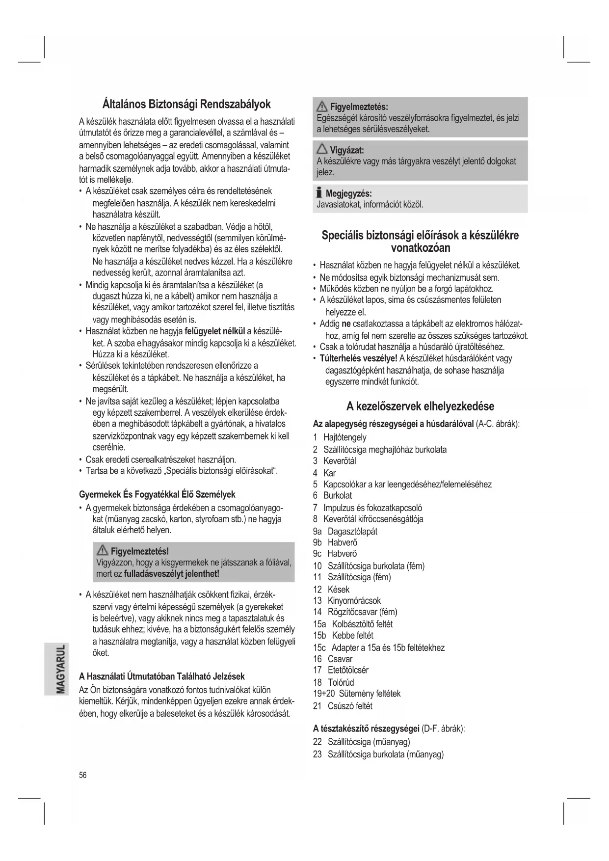 - Túlterhelés veszélye! A készüléket húsdarálóként vagy dagasztógépként használhatja, de sohase használja egyszerre mindkét funkciót. A kezelőszervek elhelyezkedése Az alapegység részegységei a húsdarálóval (A-C. ábrák): 1 Hajtótengely 2 Szállítócsiga meghajtóház burkolata 3 Keverőtál 4 Kar 5 Kapcsolókar a kar leengedéséhez/felemeléséhez 6 Burkolat 7 Impulzus és fokozatkapcsoló 8 Keverőtál kifröccsenésgátlója 9a Dagasztólapát 9b Habverő 9c Habverő 10 Szállítócsiga burkolata (fém) 11 Szállítócsiga (fém) 12 Kések 13 Kinyomórácsok 14 Rögzítőcsavar (fém) 15a Kolbásztöltő feltét 15b Kebbe feltét 15c Adapter a 15a és 15b feltétekhez 16 Csavar 17 Etetőtölcsér 18 Tolórúd 19+20 Sütemény feltétek 21 Csúszó feltét A tésztakészítő részegységei (D-F. ábrák): 22 Szállítócsiga (műanyag) 23 Szállítócsiga burkolata (műanyag)57 24 Rögzítőcsavar (műanyag) 25 Lasagna tésztaforma 26 Makaróni/penne tésztaforma 27 Tagliatelle tésztaforma 28 Vastag spagetti tésztaforma 29 Vékony spagetti tésztaforma Mixer részegységei (G. ábra): 30 Keverőtartály fedele a beöntőnyílással 31 Fedél beöntőnyílása 32 Keverőtartály 33 Rögzítőmechanizmus késkészlettel A csomag tartalma 1 X Dagasztó/mixer alapegység 1 X Keverőtál 1 X Kifröccsenésgátló etetőtölcsérrel 1 X Dagasztólapát 1 X Habverő 1 X Habverő 1 X Szállítócsiga burkolata 1 X Szállítócsiga 1 X Kés 3 X Kinyomórács 1 X Rögzítőcsavar 1 X Kolbász feltét 1 X Kebbe feltét 1 X Adapter a kolbász/kebbe feltéthez 1 X Csavar 1 X Etetőtölcsér 1 X Tolórúd 1 X Sütemény feltét, 3 darabos 1 X Szállítócsiga (műanyag) 1 X Szállítócsiga burkolata (műanyag) 1 X Rögzítőcsavar (műanyag) 1 X Lasagna tésztaforma 1 X Makaróni/penne tésztaforma 1 X Tagliatelle tésztaforma 1 X Vastag spagetti tésztaforma 1 X Vékony spagetti tésztaforma 1 X Fedél beöntőnyílással 1 X Keverőtartály fedele beöntőnyílással 1 X Keverőtartály Nincs ábra 1 X Tárolódoboz 1 X Eszköz a tésztakészítő mechanizmus rögzítéséhez Használati útmutató - keverőtál