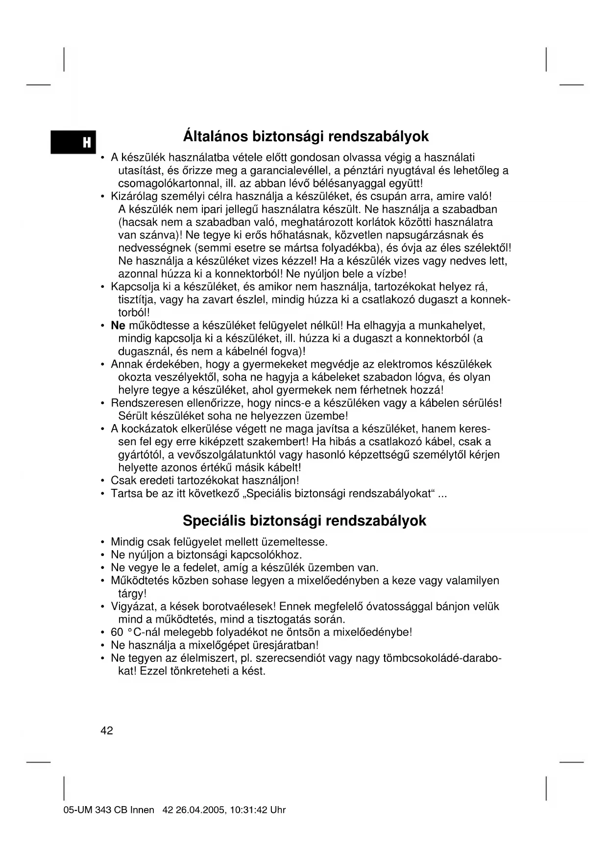 - Hagyja az edényt megszáradni. Ezt a készüléket az Európa Tanács minden vonatkozó aktuális irányelve szerint (pl. elektromágnesesség-elviselő képesség vagy kisfeszültség-elviselő képesség) ellenőriztük, és a legújabb biztonságtechnikai előírások szerint készült. Megjegyezzük az esetleges müszaki változásokat! Garancia Az általunk forgalmazott készülékre a vétel időpontjától (pénztári nyugta) számított 24 havi garanciát vállalunk. A garanciális időn belül saját mérlegelésünk szerint javítással vagy cserével díjtalanul megszüntetjük a készülék vagy a tartozék *) olyan hiányosságait, ame- lyek anyaghibára vagy gyártási hibára vezethetők vissza. A garanciális szolgál- tatások sem a garanciális idő meghosszabbítását nem eredményezik, sem nem alapoznak meg újabb garanciára való igényt! A garancia igazolására a pénztári nyugta szolgál. E nélkül az igazolás nélkül sem díjmentes csere, sem díjtalan javítás nem végezhető. Garanciális esetben szíveskedjék az alapkészüléket eredeti csomagolásában a pénztári nyugtával együtt átadni a kereskedőjének! *) A tartozékok a jogszabályban előírt szavatossági kötelezettség (6 hónap) hatálya alá tartoznak, és nem vezetnek az egész készülék díjtalan cseréjére. Ilyen esetben ne a készüléket küldje be, ill. rendelje meg, hanem vevőszolgálatunkkal egyeztetve csak a hibás tartozékot! Az üvegtörés okozta hibák mindig térítésköte- lesek! Sem az elhasználódó tartozékokban, ill. kopó alkatrészekben (pl. szénkefe, dagasztóhorog, hajtószíj, póttávvezérlő, pótfogkefe, fűrészlap stb.) bekövetkező hibák, sem a tisztítás, karbantartás vagy a kopó alkatrészek cseréje nem esik a garancia hatálya alá, következésképp térítésköteles. Illetéktelen beavatkozás a garancia megszűnését eredményezi. A garanciális idő után A garanciális idő eltelte után a megfelelő szakkereskedésben vagy javítószolgálat- nál végeztethet térítésköteles javításokat. 05-UM 343 CB Innen 44 26.04.2005, 10:31:43 UhrH