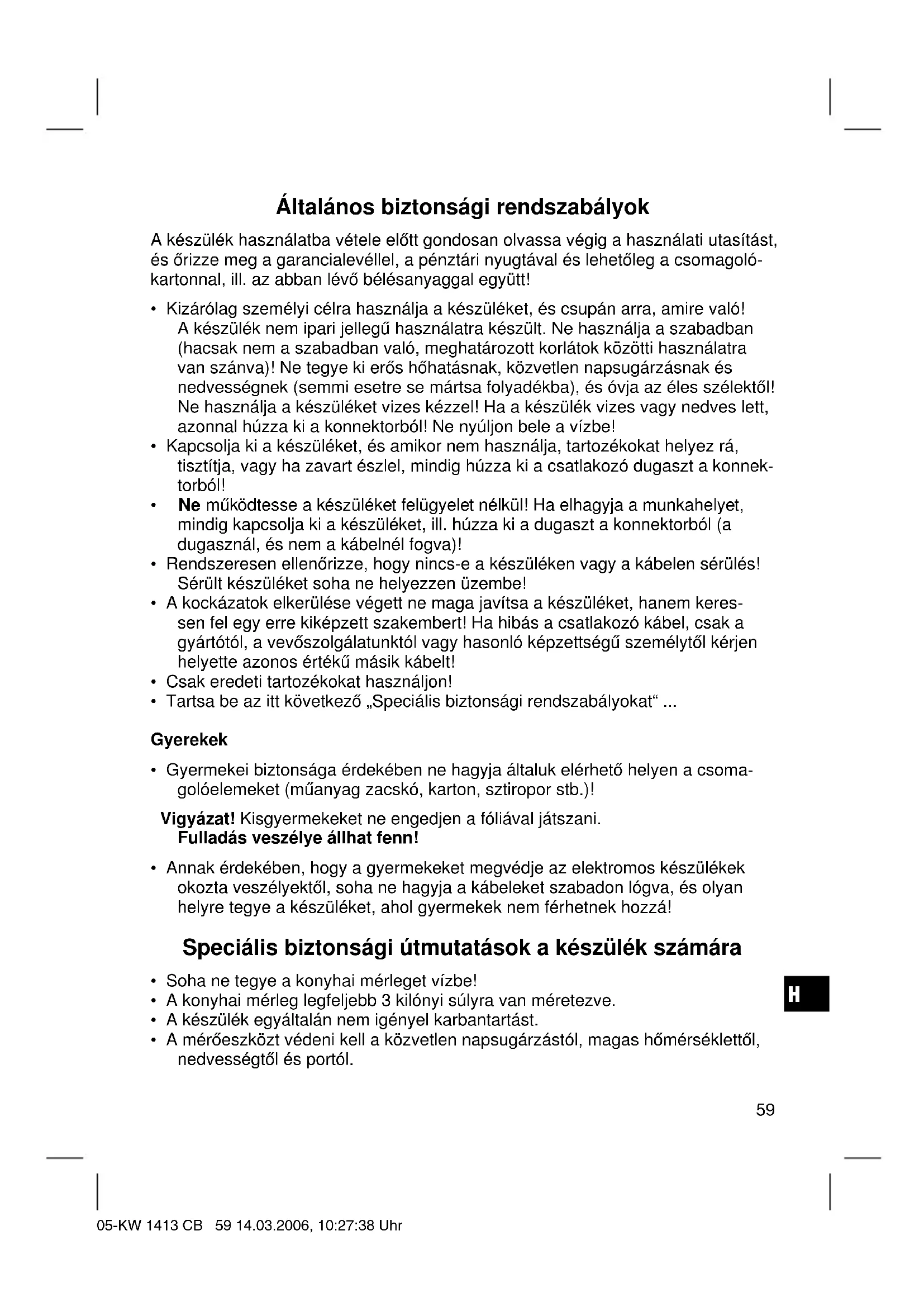 - Tisztítás után gondosan törölje meg a készüléket száraz, puha ruhával! Műszaki adatok Modell: ..................................................................................................KW 1413 CB Feszültségellátás:........................................................................ DC 3 V (CR 3032) Max. súlyterhelhetőség:......................................................................................3 kg Ezt a készüléket az Európa Tanács minden vonatkozó aktuális irányelve szerint (pl. elektromágnesesség-elviselő képesség vagy kisfeszültség-elviselő képesség) ellenőriztük, és a legújabb biztonságtechnikai előírások szerint készült. Megjegyezzük az esetleges müszaki változásokat! Garancia Garanciális igényeivel forduljon, kérem, a szerződéses kereskedőjéhez! A garancia igazolására a pénztári nyugta szolgál. E nélkül az igazolás nélkül sem díjmentes csere, sem díjtalan javítás nem végezhető. Garanciális esetben eredeti csomagolásában adja át az alapkészüléket a pénz- tári bizonylattal együtt annak a kereskedőnek, akitől a készüléket vásárolta! *) A tartozékok hibái nem eredményezik automatikusan az egész készülék díjtalan cseréjét. Ilyen esetekben forduljon „forró vonalunkhoz”! Az üvegtörésből, ill. a műanyag alkatrészek töréséből eredő hibák megszüntetése mindenkor térítésköteles. 05-KW 1413 CB 62 14.03.2006, 10:27:43 UhrH