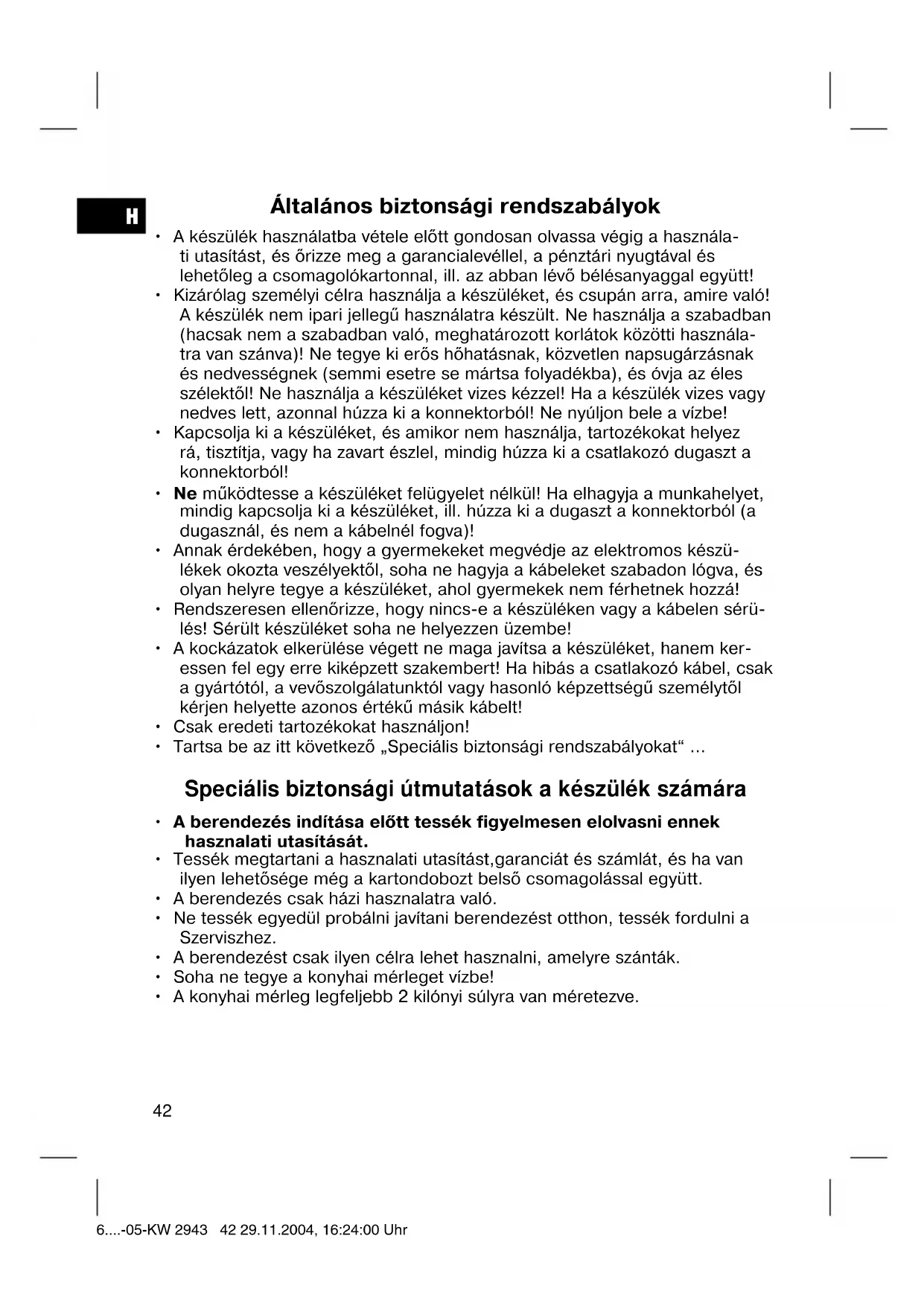 - Ha a kijelzőn „EE“ jelenik meg, akkor a mérendő súly meghaladja a 2 kg- ot. Ezt a készüléket az Európa Tanács minden vonatkozó aktuális irányelve szerint (pl. elektromágnesesség-elviselő képesség vagy kisfeszültség-elviselő képes- ség) ellenőriztük, és a legújabb biztonságtechnikai előírások szerint készült. Megjegyezzük az esetleges müszaki változásokat! Garancia Az általunk forgalmazott készülékre a vétel időpontjától (pénztári nyugta) számított 24 havi garanciát vállalunk. A garanciális időn belül saját mérlegelésünk szerint javítással vagy cserével díjtalanul megszüntetjük a készülék vagy a tartozék *) olyan hiányosságait, amelyek anyaghibára vagy gyártási hibára vezethetők vissza. A garanciális szolgáltatások sem a garanciális idő meghosszabbítását nem eredményezik, sem nem alapoznak meg újabb garanciára való igényt! A garancia igazolására a pénztári nyugta szolgál. E nélkül az igazolás nélkül sem díjmentes csere, sem díjtalan javítás nem végezhető. Garanciális esetben szíveskedjék az alapkészüléket eredeti csomagolásában a pénztári nyugtával együtt átadni a kereskedőjének! *) A tartozékok a jogszabályban előírt szavatossági kötelezettség (6 hónap) hatálya alá tartoznak, és nem vezetnek az egész készülék díjtalan cse- réjére. Ilyen esetben ne a készüléket küldje be, ill. rendelje meg, hanem vevőszolgálatunkkal egyeztetve csak a hibás tartozékot! Az üvegtörés okozta hibák mindig térítéskötelesek! 6....-05-KW 2943 44 29.11.2004, 16:24:01 UhrH