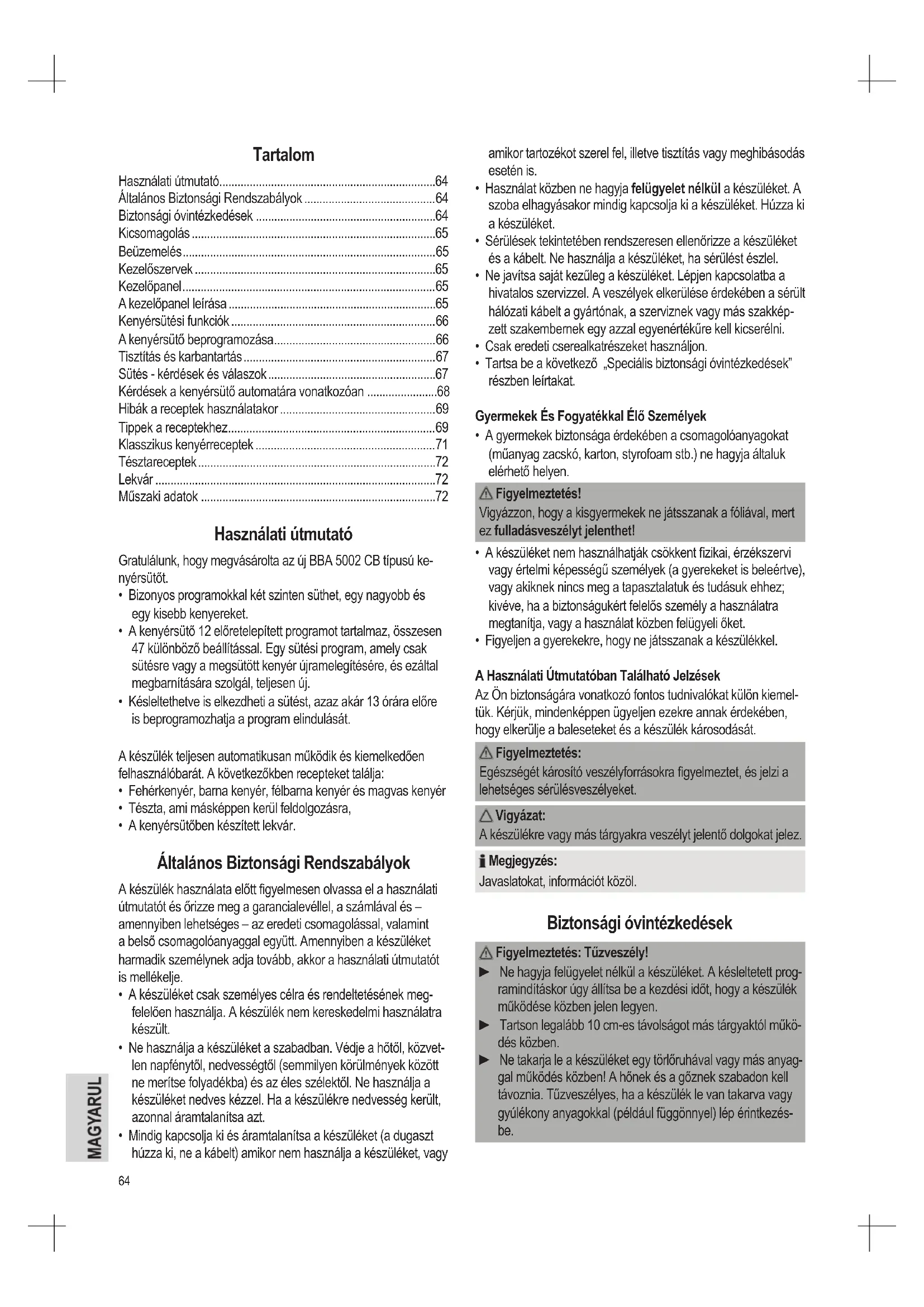 - A kenyérsütőben készített lekvár. Általános Biztonsági Rendszabályok A készülék használata előtt gyelmesen olvassa el a használati útmutatót és őrizze meg a garancialevéllel, a számlával és – amennyiben lehetséges – az eredeti csomagolással, valamint a belső csomagolóanyaggal együtt. Amennyiben a készüléket harmadik személynek adja tovább, akkor a használati útmutatót is mellékelje.