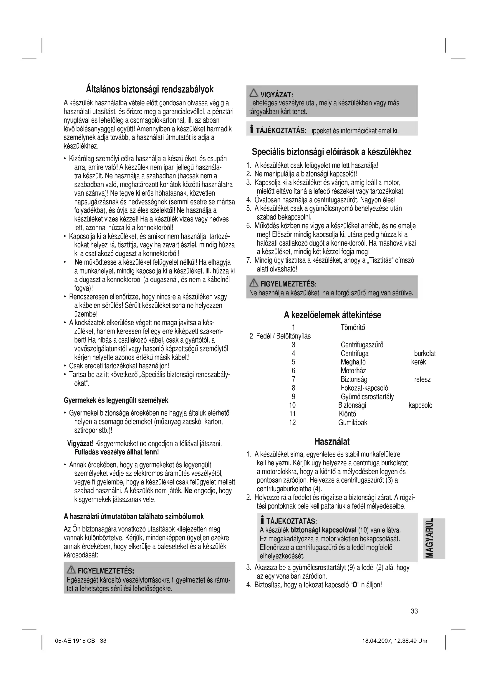 - A centrifugaszűrő tisztításához kérjük használjon moso- gatókefét vagy ecsetet. FIGYELMEZTETÉS: A centrifugaszűrő nagyon éles! Balesetveszély!