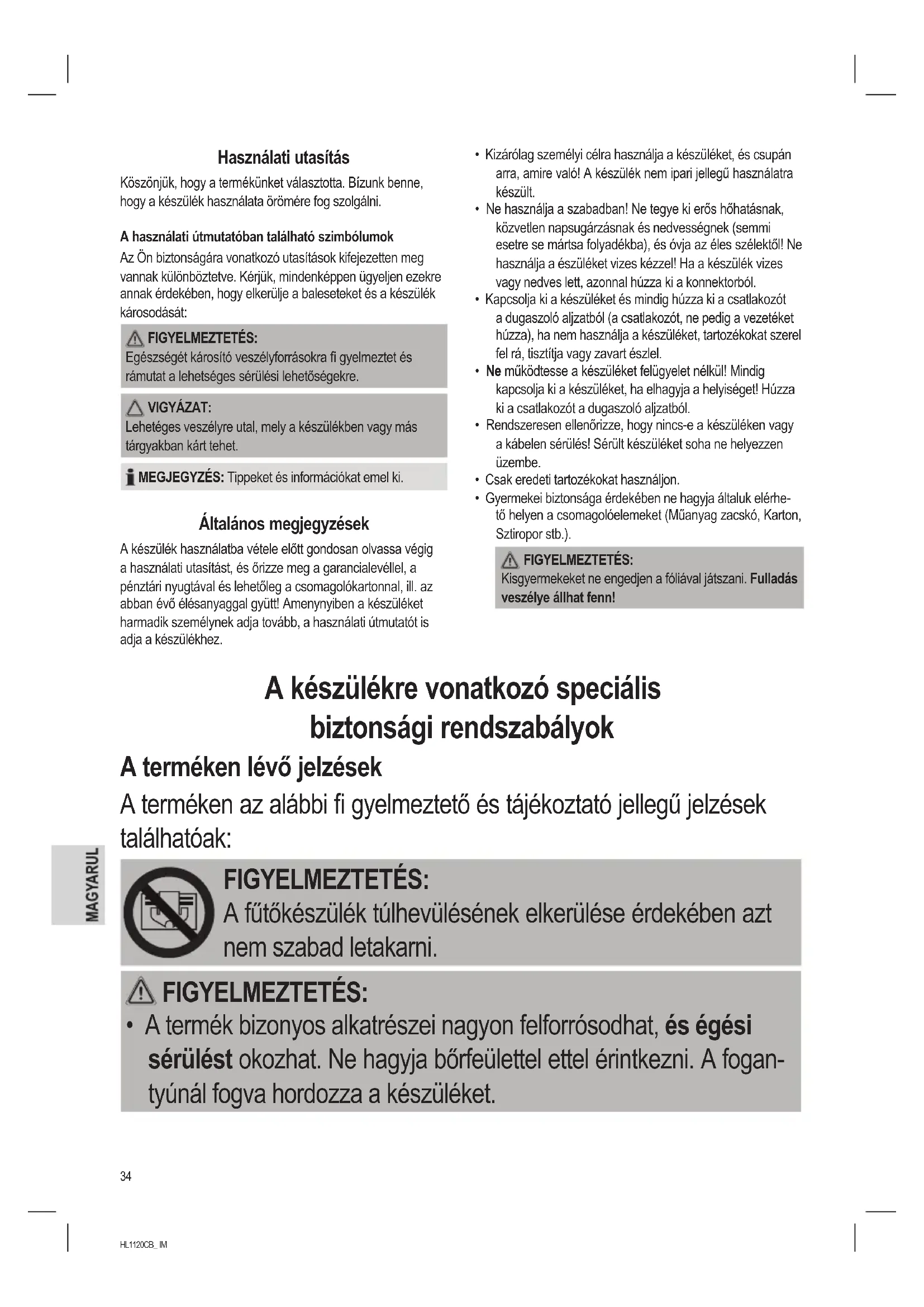 - A termék bizonyos alkatrészei nagyon felforrósodhat, és égési sérülést okozhat. Ne hagyja bőrfeülettel ettel érintkezni. A fogan- tyúnál fogva hordozza a készüléket.35 HL1120CB_ IM 07.04.16 FIGYELMEZTETÉS: