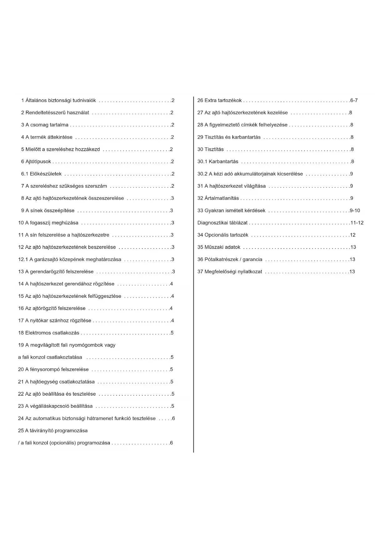 ZÖR AZ ALÁBBI BIZTONSÁGTECHNIKAI TUDNIVALÓKAT OLVASSA EL! VIGYÁZAT! - A kaput feltétlenül ki kell egyensúlyozni. A nem mozgó vagy beragadt kapukat feltétlenül meg kell javítani. A garázskapuk, kapurugók, kábelek, alátétek, tartószerkezetek és sínek ebben az esetben extrém feszültség alatt állnak, ami súlyos károsodáshoz vezethet. Ne próbálkozzon a kapu lazításával, mozgatásával, vagy beállításával, hanem hívja a karbantartó szolgálatot, vagy a kapuszerelő szakembert. - A kapu meghajtójának felszerelése, ill. karbantartása során ne viseljen ékszert, órát, vagy laza ruházatot. - A becsípődéssel járó súlyos sérülések elkerülése érdekében a kapu meghajtójának karbantartása előtt a kapuhoz tartozó összes kötelet és láncot le kell szerelni. - A beszerelés és elektromos bekötés során a helyileg érvényes építési előírásokat és az elektromosságra vonatkozó előírásokat be kell tartani. Ez a készülék a 2. érintésvédelmi osztályba tartozik, földelése szükségte- len. - A különösen gyenge kapukon (pl. üvegszálas, alumínium-, vagy acélka- puk) keletkező sérülések elkerülése érdekében megfelelő erősítést kell alkalmazni. Ebben az esetben forduljon a kapu gyártójához. - Az automatikus biztonsági hátrafutást egy tesztnek kell alávetni. A földön található 50 mm magas akadály esetén a garázskapunak vissza KELL húzódnia. A kapumeghajtás nem szabályszerű beállítása a csukódó kapunak köszönhetően súlyos sérülésekhez vezethet. A tesztet havonta egyszer meg kell ismételni, és adott esetben a szükséges változtatásokat végre kell hajtani. - Ezt a berendezést nem szabad nyirkos, vagy vizes helyiségekbe besz- erelni. - A működés során a kapu semmilyen körülmények között nem képezhet akadályt nyilvános átjárókban. - Annak érdekében, hogy az összes használót emlékeztessük a helyes használatra, a kivilágított fali billentyűzet mellé helyezzük el a gyerekek védelmére figyelmeztető táblát. A beszorulásra figyelmeztető táblákat jól látható módon helyezzük el. - Feltétlenül ügyeljünk a gyerekekre annak érdekében, hogy ne játsszanak az eszközzel. - Ez az eszköz nem arra való, hogy korlátozott fizikai, érzéki, vagy szellemi képességű, vagy megfelelő tapasztalattal és/vagy tudással nem rendelkező személyek (beleértve a gyerekeket) használják, kivéve, ha őket biztonságukért felelős személy felügyeli, vagy tőle az eszköz használatára vonatkozó utasítást kapnak. - A kapu károsodásának elkerülése érdekében kapcsoljunk ki minden meglévő zárat. - Adott esetben a kezelő berendezéseket a kapuból látható távolságba, és gyerekek által el nem érhető helyre KELL szerelni. Gyerekek számára a billentyűk, vagy rádiótávirányítók használatát nem szabad megengedni. A kapumeghajtó helytelen használata súlyos sérülésekhez vezethet. - A kapumeghajtót CSAK akkor szabad használni, ha a kezelést végző személy a kapu körüli teljes területet belátja, és ez akadályoktól mentes, valamint a kapumeghajtó rendeltetésszerűen beállításra került. Senki nem mehet be a kapun, ameddig az mozgásban van. Gyerekeknek nem szabad megengedni, hogy a kapu közelében játsszanak. - Kézi kireteszelést csak a futókocsi meghajtótól való leválasztása esetén és – ha lehetséges – CSAK zárt kapu esetén alkalmazzunk. A piros fogantyút ne használjuk a kapu kinyitására, ill. becsukására. - Javítások végzése előtt, vagy a burkolat eltávolítása előtt kapcsoljuk ki a kapumeghajtó áramellátását. - Ez a termék speciális kábellel ellátott transzformátorral rendelkezik. Prob léma esetén ezt a megfelelő képzettséggel rendelkező személyzetnek egy eredeti transzformátorra kell kicserélnie. - A vésznyitó használata esetén előfordulhat, hogy a kapu kiszámíthatatlan módon mozog, ha a rugók gyengék, vagy töröttek, vagy a kapu nincsen egyensúlyban. - A vésznyitó nyitófogantyúját legalább 1,8 m magasan kell elhelyezni. Ezeket a leírásokat feltétlenül őrizze megRendeltetésszerű használat A magáncélú felhasználásra szánt készülék lengő és szekcionált garázsajtók nyitására és zárására szolgál. A készüléket kizárólag otthoni garázsajtók működtetésére tervezték, ezért nem alkalmas és nem használ- ható kereskedelmi célokra. A hajtószerkezet minden nem rendeltetésszerű használata potenciális balesetveszélyt jelent. A gyártó nem vállal felelősséget a nem rendeltetésszerű használatért. Szállított alkatrészek Szerelés előtt vizsgálja át az összes szállított alkatrészt. Figyelem: A számozás a megfelelő fejezetre vonatkozik. Termékáttekintés Jelen ábra a készülék lépésekben történő szerelése során teljes áttek intést biztosít Önnek a készre szerelt berendezésről. Az alkatrészek áttekintése (meghajtófej):