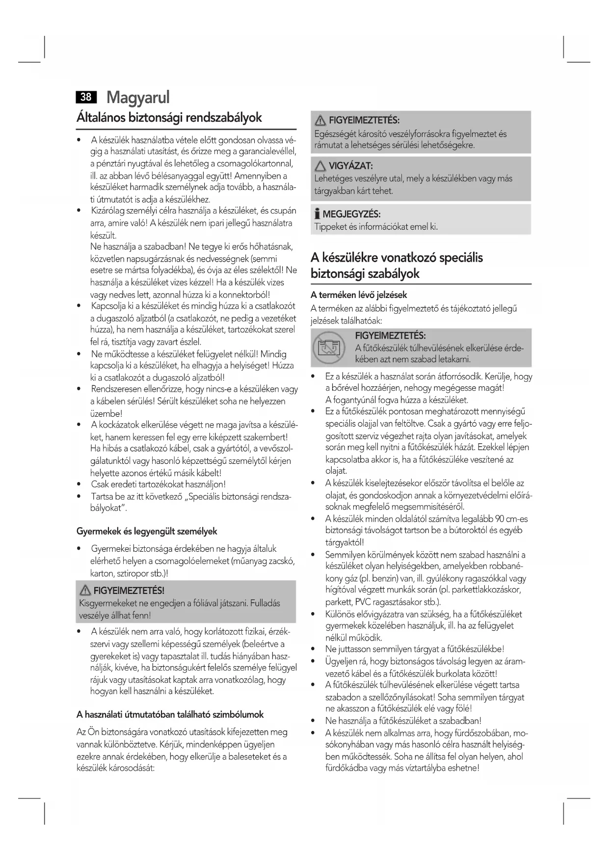 - Akészüléknemarravaló,hogykorlátozottzikai,érzék- szervi vagy szellemi képességű személyek (beleértve a gyerekeket is) vagy tapasztalat ill. tudás hiányában hasz- nálják, kivéve, ha biztonságukért felelős személye felügyel rájuk vagy utasításokat kaptak arra vonatkozólag, hogy hogyan kell használni a készüléket. A használati útmutatóban található szimbólumok Az Ön biztonságára vonatkozó utasítások kifejezetten meg vannak különböztetve. Kérjük, mindenképpen ügyeljen ezekre annak érdekében, hogy elkerülje a baleseteket és a készülékkárosodását: FIGYElMEZTETÉS: Egészségét károsító veszélyforrásokra figyelmeztet és rámutat a lehetséges sérülési lehetőségekre. VIGYÁZAT: Lehetéges veszélyre utal, mely a készülékben vagy más tárgyakban kárt tehet. MEGJEGYZÉS: Tippeket és információkat emel ki. A készülékre vonatkozó speciális biztonsági szabályok A terméken lévő jelzések A terméken az alábbi figyelmeztető és tájékoztató jellegű jelzésektalálhatóak: FIGYElMEZTETÉS: A fűtőkészülék túlhevülésének elkerülése érde- kében azt nem szabad letakarni.