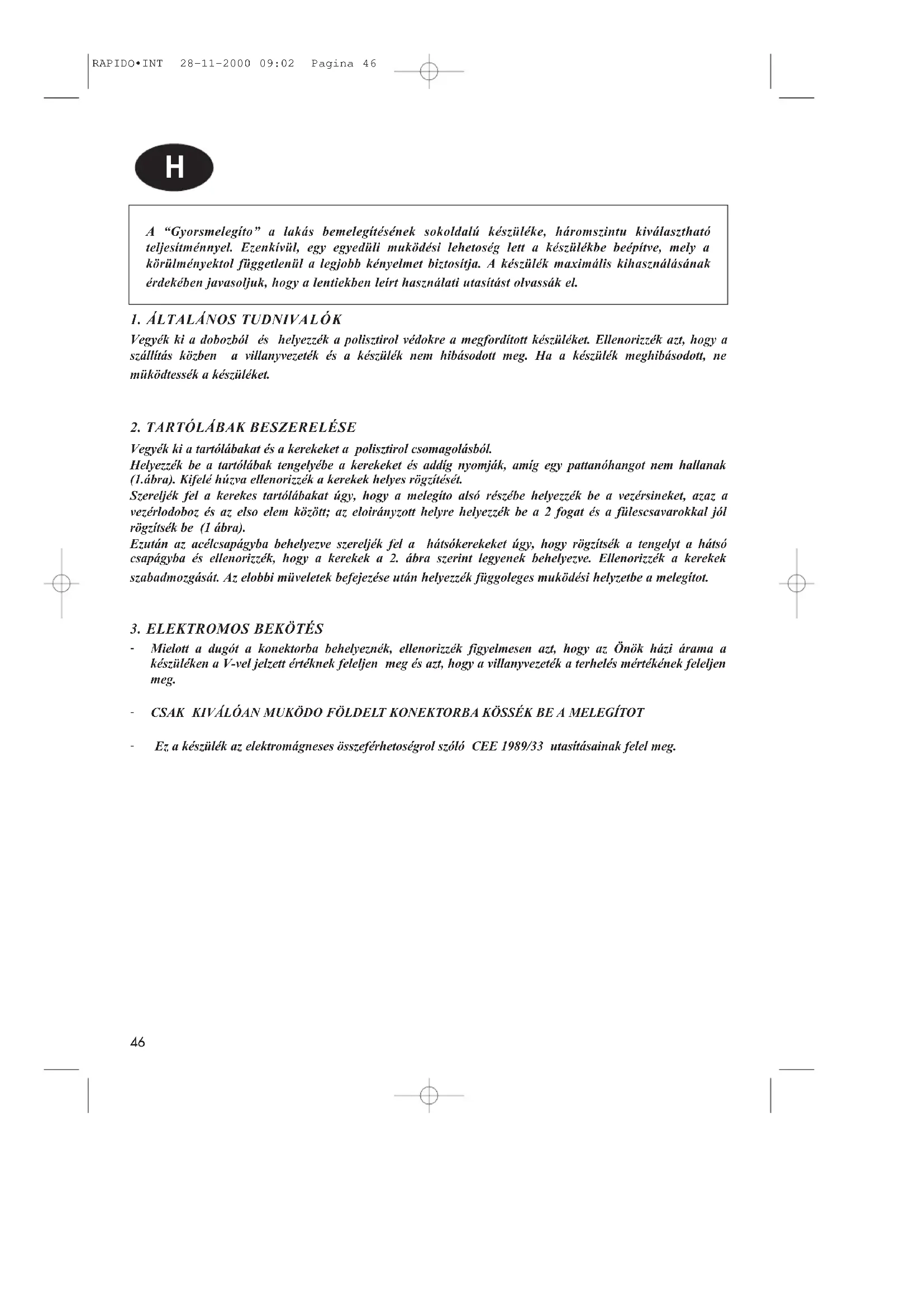 RAPIDO•INT 28-11-2000 09:02 Pagina 4546 A ÒGyorsmeleg’toÓ a lak‡s bemeleg’tŽsŽnek sokoldalœ kŽszŸlŽke, h‡romszintu kiv‡laszthat— teljes’tmŽnnyel. Ezenk’vŸl, egy egyedŸli mukšdŽsi lehetosŽg lett a kŽszŸlŽkbe beŽp’tve, mely a kšrŸlmŽnyektol fŸggetlenŸl a legjobb kŽnyelmet biztos’tja. A kŽszŸlŽk maxim‡lis kihaszn‡l‡s‡nak ŽrdekŽben javasoljuk, hogy a lentiekben le’rt haszn‡lati utas’t‡st olvass‡k el.