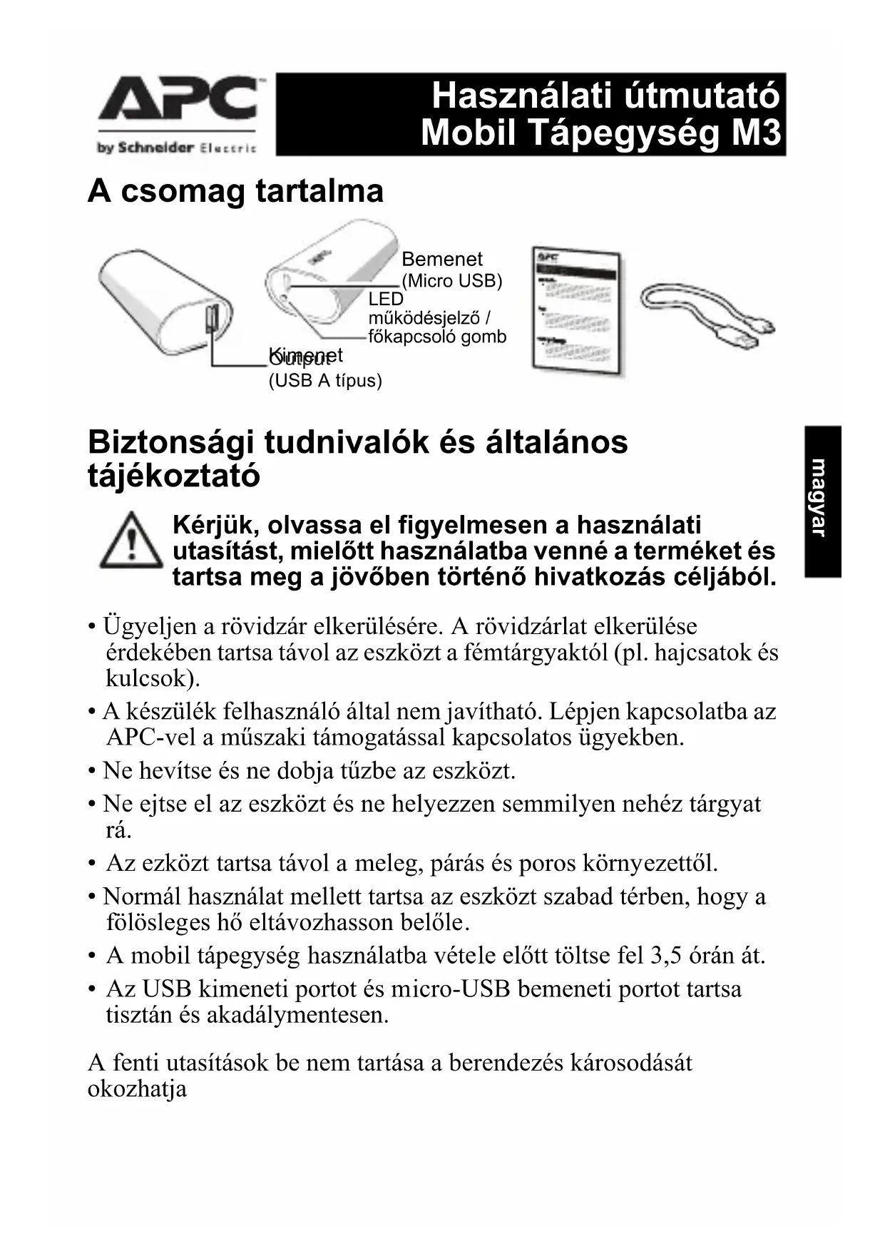 F)© 2015 APC by Schneider Electric. Az APC és az APC logó a Schneider Electric Industries S.A.S., illetve leányvállalataik tulajdona. Minden más védjegy az adott tulajdonosé. HU 990-5593 01/2015 magyar Hibaelhárítás Az APC by Schneider Electric IT nemzetközi vevőszolgálata Az országra jellemző garanciális információkért lépjen az APC by Schneider Electric weboldalára: www.apc.com. Probléma / Lehetséges ok Megoldás A mobil tápegységet nem lehet feltölteni Lehet, hogy az USB-töltő meghibásodott, vagy a számítógép alvó módban van. Próbálkozzon másik USB-töltő használatával, vagy ébressze fel a számítógépet alvó módból. A micro-USB-kábel és csatlkaozó-érintkezői elkoptak. Próbálkozzon új micro-USB- csatlakozó használatával. A mobil tápegység egyes eszközöket nem tud feltölteni. Elképzelhető, hogy a mobil tápegységnbek nem sikerült felismernie és észlelnie a hozzá csatlakoztatott eszközöket. Előfordulhat, hogy egyes utángyártott USB-kábelek nem működnek megfelelően az M3 tápegységgel. A probléma megoldásához nyomja meg a főkapcsoló gombot az M3 tápegységen az eszköz töltésének indításához. Ha az akkumulátor egység ennek ellenére sem tölti eszközét, cserélje ki az utángyártott kábelt az eszközhöz mellékelt eredeti kábelre. Túlterhelés lépett fel, és az M3 narancssárga LED-je villog. Az M3 tölti az eszközt, és USB- kimeneti áramerőssége meghaladja a megadott határértéket. Válassza le a töltés alatt álló eszközt az M3 tápegységről. A mobil tápegység élettartamának végéhez ért, vagy meghibásodott. Rendszerhiba esetén forduljon a helyi APC by Schneider Electric forgalmazóhoz vagy egy felhatalmazott APC by Schneider Electric szervizhez.Қазақ тілі Áұéûì Қауіпсіздік бойынша жəне жалпы ақпарат Өнімді пайдаланбас бұрын осы пайдаланушы нұсқаулығын мұқият оқыңыз жəне болашақта анықтама алу үшін сақтап қойыңыз.