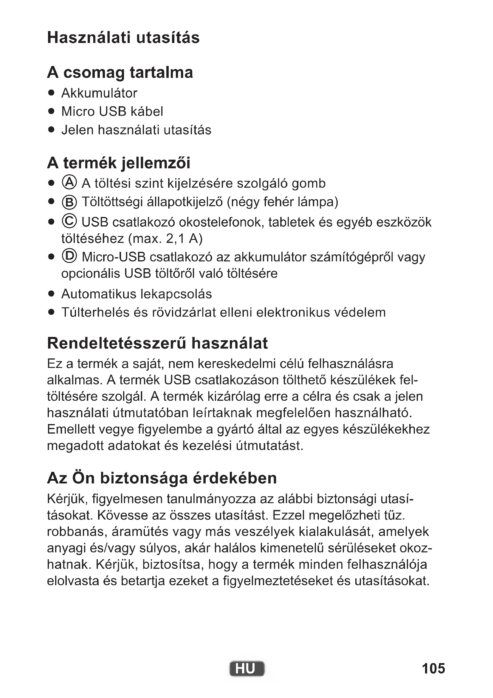 Túlterhelés és rövidzárlat elleni elektronikus védelem Rendeltetésszerű használat Ez a termék a saját, nem kereskedelmi célú felhasználásra alkalmas. A termék USB csatlakozáson tölthető készülékek fel- töltésére szolgál. A termék kizárólag erre a célra és csak a jelen használati útmutatóban leírtaknak megfelelően használható. Emellett vegye gyelembe a gyártó által az egyes készülékekhez megadott adatokat és kezelési útmutatást. Az Ön biztonsága érdekében Kérjük, gyelmesen tanulmányozza az alábbi biztonsági utasí- tásokat. Kövesse az összes utasítást. Ezzel megelőzheti tűz. robbanás, áramütés vagy más veszélyek kialakulását, amelyek anyagi és/vagy súlyos, akár halálos kimenetelű sérüléseket okoz- hatnak. Kérjük, biztosítsa, hogy a termék minden felhasználója elolvasta és betartja ezeket a gyelmeztetéseket és utasításokat.106