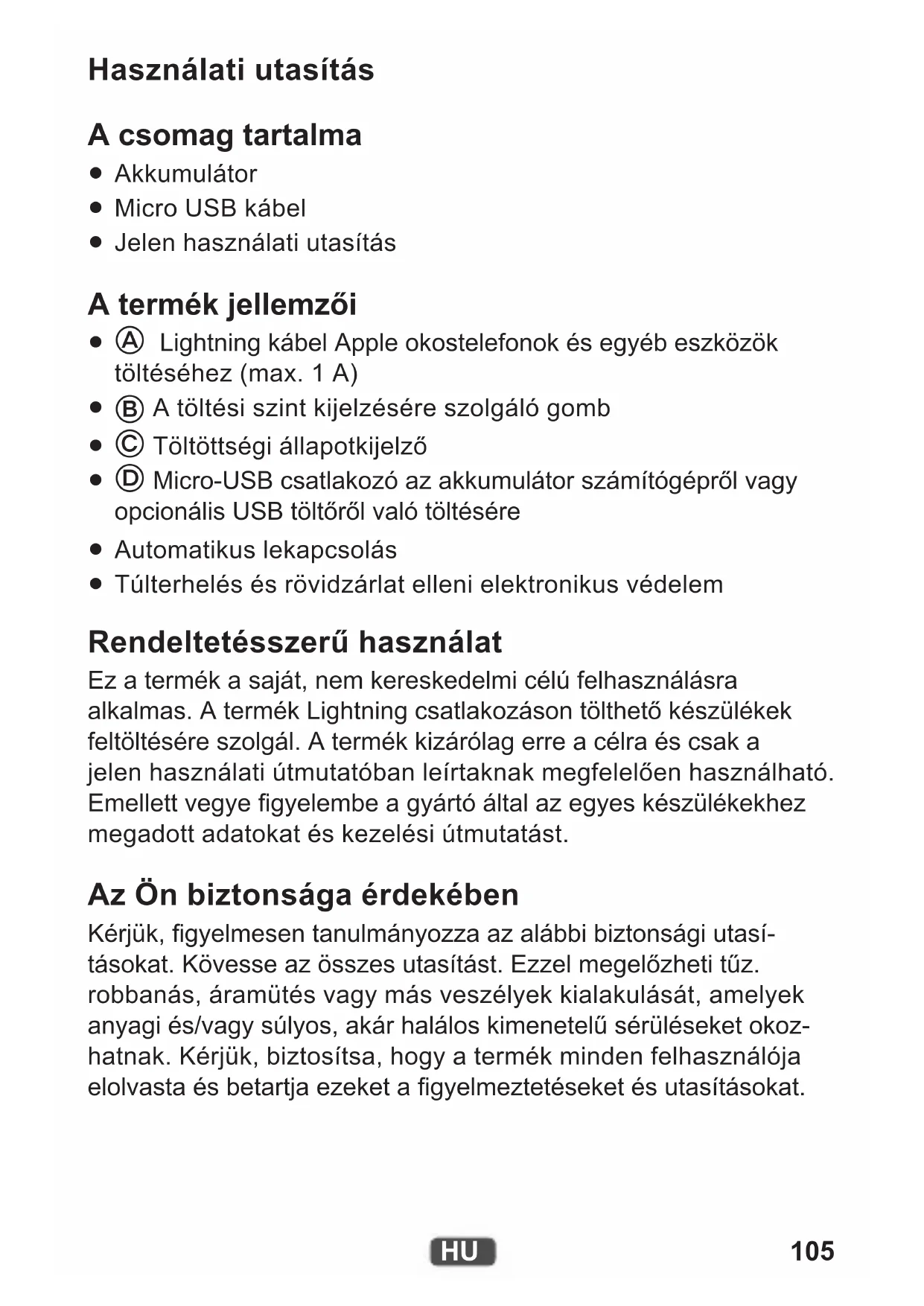 Túlterhelés és rövidzárlat elleni elektronikus védelem Rendeltetésszerű használat Ez a termék a saját, nem kereskedelmi célú felhasználásra alkalmas. A termék Lightning csatlakozáson tölthető készülékek feltöltésére szolgál. A termék kizárólag erre a célra és csak a jelen használati útmutatóban leírtaknak megfelelően használható. Emellett vegye gyelembe a gyártó által az egyes készülékekhez megadott adatokat és kezelési útmutatást. Az Ön biztonsága érdekében Kérjük, gyelmesen tanulmányozza az alábbi biztonsági utasí- tásokat. Kövesse az összes utasítást. Ezzel megelőzheti tűz. robbanás, áramütés vagy más veszélyek kialakulását, amelyek anyagi és/vagy súlyos, akár halálos kimenetelű sérüléseket okoz- hatnak. Kérjük, biztosítsa, hogy a termék minden felhasználója elolvasta és betartja ezeket a gyelmeztetéseket és utasításokat.106
