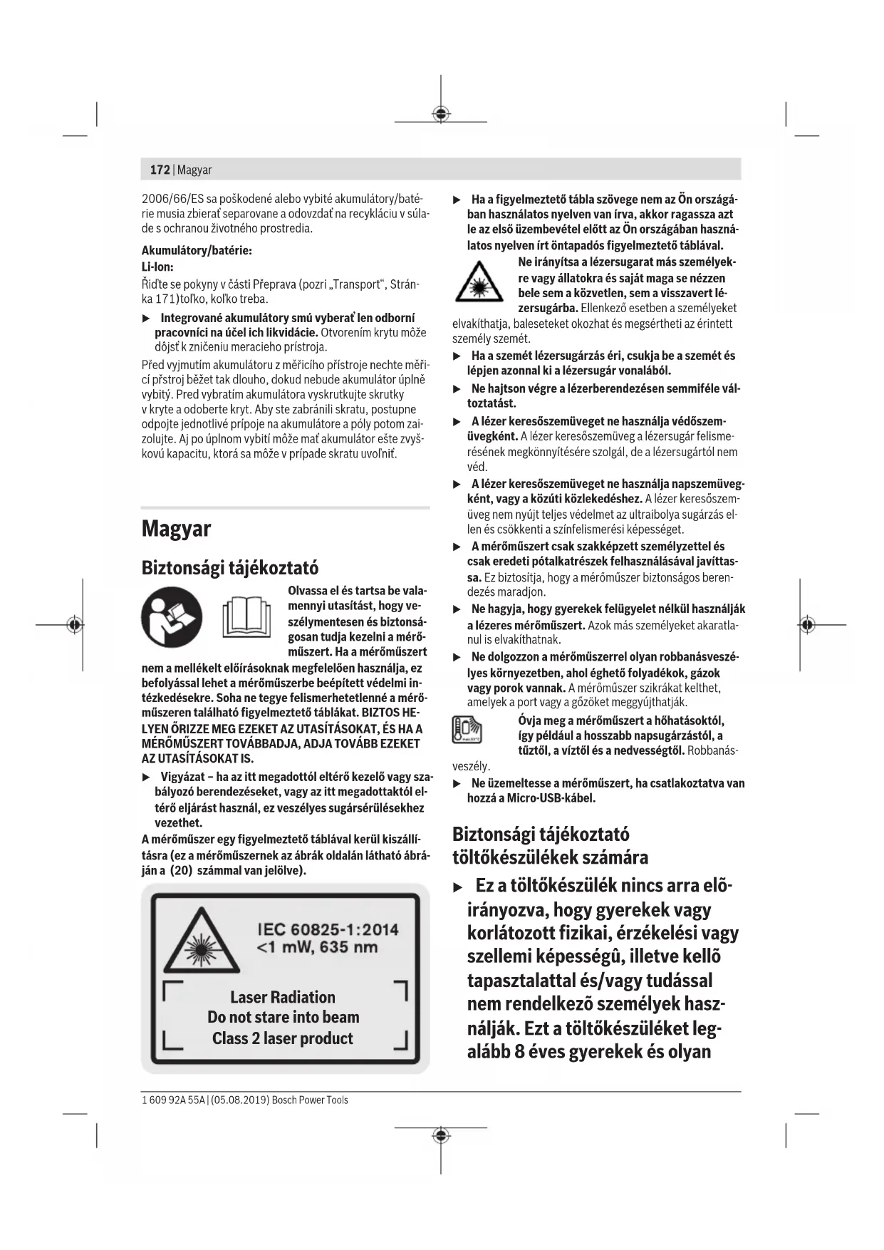 Ossza fel közbenső lépésekre a számítást ">60°" vagy "<–60°" kijelzés a kijelzőn Az adott mérési funkcióhoz, illetve referenciasíkhoz tarto- zó dőlési mérési tartomány túl van lépve. Csak a megadott szögtarto- mányon belül hajtsa végre a mérést. "CAL" és "ERROR" kijelzése a kijelzőn 1 609 92A 55A | (05.08.2019) Bosch Power ToolsMagyar | 181 A hiba oka Hibaelhárítás A lejtésmérés kalibrálását nem a helyes sorrendben vagy nem a helyes helyzetek- ben hajtották végre. Ismételje meg a kalibrációt a kijelzőn és az Üzemeltetési útmutatóban található infor- mációknak megfelelően a ka- librálást. A kalibrációhoz használt felü- letek nem voltak pontosan vízszintes vagy függőleges helyzetbe beállítva. Ismételje meg a kalibrálást egy valóban vízszintes, illetve függőleges helyzetű felület- tel. Szükség esetén a kalibrá- lás előtt ellenőrizze egy víz- mértékkel a felület helyzetét. A mérőműszert a gomb meg- nyomásakor megmozgatták, illetve megbillentették. Ismételje meg a kalibrálást és tartsa a mérőműszer a gomb megnyomása során mozdu- latlanul a felületen. Az akkumulátor-feltöltési szintjelző display ((g)), a hő- mérséklet figyelmeztetés ((j)) és az "ERROR" kijelzés látható a kijelzőn A mérőműszer hőmérséklete a megengedett töltési hő- mérséklet tartományon kívül van Várja meg, amíg az akkumu- látor hőmérséklete eléri a töl- tési hőmérséklet tartományt. Az akkumulátor-feltöltési szintjelző display ((g)) és az "ERROR" kijelzés látható a kijelzőn Nem megfelelő akkumulátor töltőfeszültség Ellenőrizze, hogy a dugós csatlakozó helyesen van-e csatlakoztatva és hogy a Mic- ro-USB-kábel előírásszerűen működik-e. Ha a készülék jele villog, az akkumulátor meghi- básodott és azt a Bosch-ve- vőszolgálattal ki kell cserél- tetni. Akkumulátor-feltöltési szintjelző display ((g)) és órajel ((f)) a kijelzőn Lényegesen hosszabb töltési idő, mivel a töltőáram túl ala- csony. Kizárólag eredeti Bosch Mic- ro-USB-kábelt használjon. A mérési eredmény nem plauzibilis A célfelület nem egyértelmű- en veri vissza a fényt (például víz, üveg). Takarja le a célfelületet A lézersugár (16)kilépési pontját, illetve a (17)vevő lencsét valami letakarja. Tartsa szabadon a lézersugár (16)kilépési pontját, illetve a (17)vevő lencsét Hibás vonatkoztatási sík van beállítva Állítsa be a méréshez illő vo- natkoztatási síkot A lézersugár útjában valami- lyen akadály van A lézerpontnak teljes mérték- ben a célfelületen kell lennie. A kijelzés változatlan marad, vagy a mérőműszer várat- lan módon reagál a gombnyomásra Szoftverhiba Nyomja meg egyidejűleg a (2)mérési gombot és a A hiba oka Hibaelhárítás (8)memória törlő / be-/ki- kapcsoló gombot, hogy ezzel visszaállítsa a szoftvert. A mérőműszer a saját előírásszerű működését minden mérésnél ellenőrzi. Egy hiba észlelése- kor a kijelzőn csak az itt látható szimbólum lát- ható. Ebben az esetben, vagy ha a fent meg- adott hibaelhárítási intézkedésekkel sem sike- rül elhárítani a hibát, küldje el a mérőműszert a kereskedőn keresztül a Bosch-vevőszolgálatnak. Karbantartás és szerviz Karbantartás és tisztítás A mérőműszert csak az azzal együtt szállított védőtáskában tárolja és szállítsa. Tartsa mindig tisztán a mérőműszert. Ne merítse bele a mérőműszert vízbe vagy más folyadékok- ba. A szennyeződéseket egy nedves, puha kendővel törölje le. Tisztító- vagy oldószereket ne használjon. Mindenek előtt a (17) vevő lencsét ugyanolyan gondosan ápolja, ahogyan egy szemüveget, vagy egy fényképezőgép lencséjét kell kezelni. Ha javításra van szükség, a (24)védőtáskába csomagolva küldje be a mérőműszert. Vevőszolgálat és alkalmazási tanácsadás A vevőszolgálat a terméke javításával és karbantartásával, valamint a pótalkatrészekkel kapcsolatos kérdésekre szíve- sen válaszol. A pótalkatrészekkel kapcsolatos robbantott áb- rák és egyéb információk a következő címen találhatók: www.bosch-pt.com A Bosch Alkalmazási Tanácsadó Team a termékeinkkel és azok tartozékaival kapcsolatos kérdésekben szívesen nyújt segítséget. Ha kérdései vannak vagy pótalkatrészeket szeretne rendelni, okvetlenül adja meg a termék típustábláján található 10‑je- gyű cikkszámot. Magyarország Robert Bosch Kft. 1103 Budapest Gyömrői út. 120. A www.bosch-pt.hu oldalon online megrendelheti készüléké- nek javítását. Tel.:+3618798502 Fax: +3618798505 info.bsc@hu.bosch.com www.bosch-pt.hu Szállítás A benne található lithium-ionos-akkumulátorokra a veszélyes árukra vonatkozó előírások érvényesek. A felhasználók az ak- kumulátorokat a közúti szállításban minden további nélkül szállíthatják. Bosch Power Tools 1 609 92A 55A | (05.08.2019)182 | Русский Ha az akkumulátorok szállításával harmadik személyt (példá- ul: légi vagy egyéb szállító vállalatot) bíznak meg, akkor fi- gyelembe kell venni a csomagolásra és a megjelölésre vonat- kozó különleges követelményeket. Ebben az esetben a kül- demény előkészítésébe be kell vonni egy veszélyes áru szak- embert. Hulladékkezelés A mérőműszereket, töltőkészülékeket, akkumulá- torok, tartozékokat és csomagolóanyagokat a környezetvédelmi szempontoknak megfelelően kell újrafelhasználásra leadni. Ne dobja ki a mérőműszereket, a töltőkészüléke- ket és az akkumulátorokat a háztartási szemétbe! Csak az EU‑tagországok számára: A 2012/19/EU európai irányelvnek megfelelően a már nem használható mérőműszereket és töltőkészülékeket és a 2006/66/EK európai irányelvnek megfelelően a már nem használható akkumulátorokat/elemeket külön össze kell gyűjteni és a