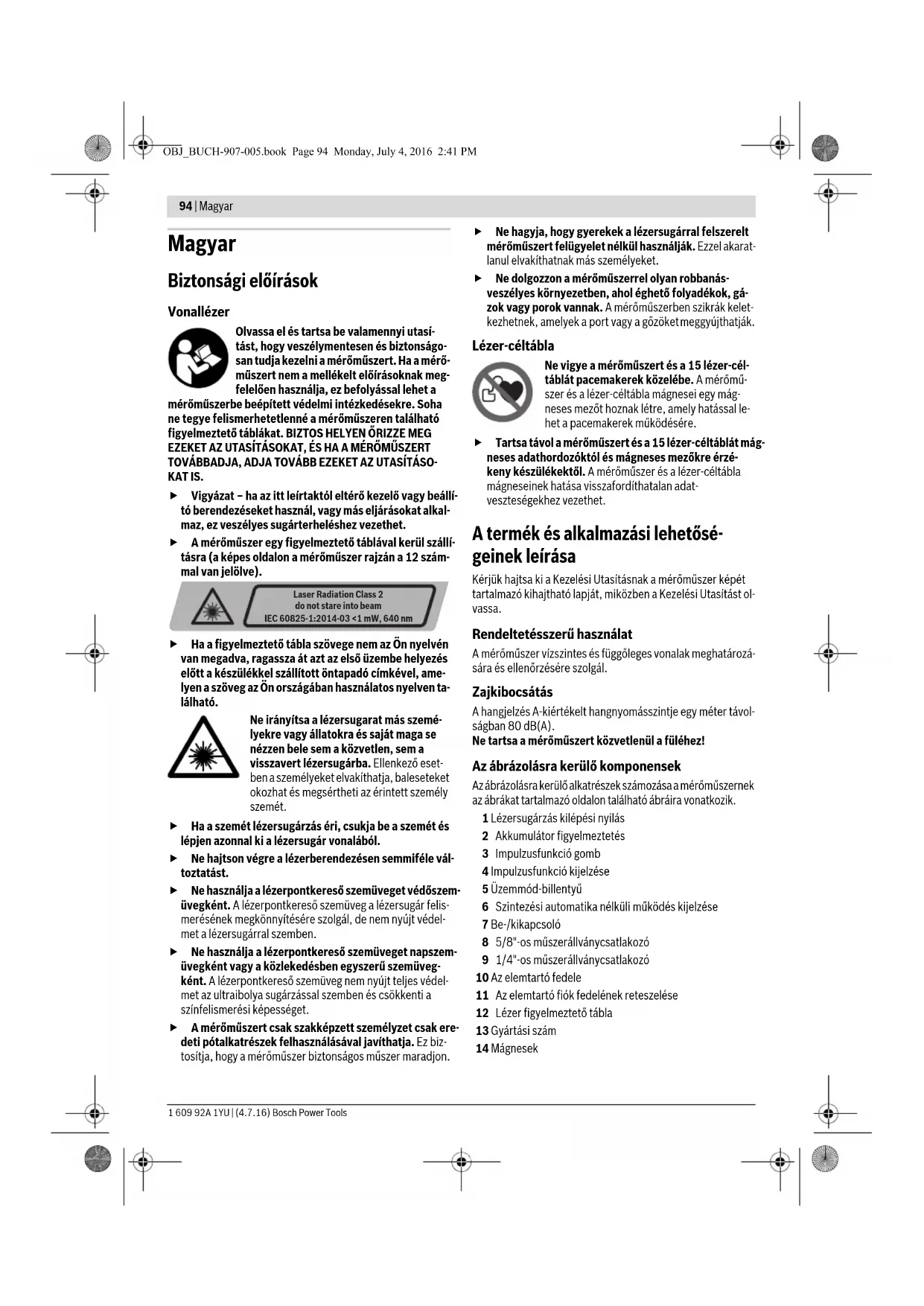 OBJ_BUCH-907-005.book Page 92 Monday, July 4, 2016 2:41 PMSlovensky | 93 Bosch Power Tools 1 609 92A 1YU | (4.7.16) Pokyny na používanie Na označovanie používajte vždy iba stred laserovej línie. Šírka laserovej línie sa vzdialenosťou mení. Práca s laserovou cieľovou tabuľkou Laserová cieľová tabuľka 15 zlepšuje viditeľnosť laserového lúča za nepriaznivých podmienok a pri väčších vzdialenostiach. Reflektujúca polovica laserovej cieľovej tabuľky 15 zlepšuje viditeľnosť laserovej čiary, cez priehľadnú polovicu je laserová čiara viditeľná aj zo zadnej strany laserovej cieľovej tabuľky. Práca so statívom (Príslušenstvo) Statív poskytuje stabilnú a výškovo nastaviteľnú meraciu pod- ložku. Upevnite merací prístroj pomocou statívového uchyte- nia 1/4" 9 na závit statívu 22. Na upevnenie na bežný staveb- ný statív použite statívové uchytenie 5/8" 8. Pomocou aretač- nej skrutky dobre upevnite merací prístroj na statív. Upevnenie pomocou univerzálneho držiaka (Príslušenstvo) (pozri obrázok D) Pomocou univerzálneho držiaka 19 môžete upevňovať merací prístroj napríklad na zvislé plochy, rúry alebo na rôzne magne- tizovateľné materiály. Univerzálny držiak je práve taký výhod- ný ako statív umiestnený na zemi a uľahčuje výškové nastavo- vanie meracieho prístroja. Práca s meracou platničkou (Príslušenstvo) (pozri obrázky A –B) Pomocou meracej platničky 16 môžete značku laserového lú- ča nanášať na podlahu, resp. laserovú výšku na stenu. Pomocou nulového políčka a stupnice sa dá odmerať vzájom- né prestavenie v želanej výške a opäť naniesť na inom mieste. Takýmto spôsobom odpadne exaktné nastavovanie prístroja na prenášanú výšku. Meracia platnička 16 je kvôli lepšej viditeľnosti laserového lú- ča na väčšie vzdialenosti, resp. pri dopade silného slnečného svetla, vybavená reflektujúcou vrstvou. Zosilnenie jasu je však identifikovateľné len vtedy, keď pozeráte na meraciu platničku paralelne k laserovému lúču. Práca s laserovým prijímačom (Príslušenstvo) (pozri obrázok D) Za nepriaznivých svetelných podmienok (svetlé okolie, pria- me slnečné žiarenie a pod.) a pri práci na väčšie vzdialenosti používajte na lepšiu identifikáciu laserových lúčov laserový prijímač 17. Pri práci s laserovým prijímačom majte zapnutú pulzovú funkciu (pozri odsek „Pulzová funkcia“, strana 91). Okuliare na zviditeľnenie laserového lúča (Príslušenstvo) Okuliare na zviditeľnenie laserového lúča filtrujú svetlo okolia. Vďaka tomu sa stáva červené svetlo lasera pre oko svetlejším. Nepoužívajte laserové okuliare ako ochranné okuliare. Laserové okuliare slúžia na lepšie zviditelnenie laserového lúča, pred laserovým žiarením však nechránia. Nepoužívajte laserové okuliare ako slnečné okuliare alebo ako ochranné okuliare v cestnej doprave. Lasero- vé okuliare neposkytujú úplnú ochranu pred ultrafialovým žiarením a znižujú vnímanie farieb. Príklady postupov (pozri obrázky C–H) Príklady pre rôzne druhy používania meracieho prístroja náj- dete na grafických stranách. Údržba a servis Údržba a čistenie Merací prístroj skladujte a transportujte v ochrannej taške, ktorá sa dodáva spolu s meracím prístrojom. Udržiavajte svoj merací prístroj vždy v čistote. Neponárajte merací prístroj do vody ani do iných kvapalín. Znečistenia utrite vlhkou mäkkou handričkou. Nepoužívajte žiadne čistiace prostriedky ani rozpúšťadlá. Čistite pravidelne predovšetkým plochy na výstupnom otvore a dávajte pozor, aby ste pritom odstránili prípadné zachytené vlákna tkaniny. V prípade potreby zasielajte merací prístroj do opravy v ochrannej taške 18. Servisné stredisko a poradenstvo pri používaní Servisné stredisko Vám odpovie na otázky týkajúce sa opravy a údržby Vášho produktu ako aj náhradných súčiastok. Rozlo- žené obrázky a informácie k náhradným súčiastkam nájdete aj na web-stránke: www.bosch-pt.com Tím poradcov Bosch Vám s radosťou poskytne pomoc pri otázkach týkajúcich sa našich produktov a ich príslušenstva. V prípade akýchkoľvek otázok a objednávok náhradných sú- čiastok uvádzajte bezpodmienečne 10-miestne vecné číslo uvedené na typovom štítku výrobku. Slovakia Na www.bosch-pt.sk si môžete objednať opravu vášho stroja alebo náhradné diely online. Tel.: (02) 48 703 800 Fax: (02) 48 703 801 E-Mail: servis.naradia@sk.bosch.com www.bosch.sk Likvidácia Výrobok, príslušenstvo a obal treba dať na recykláciu šetriacu životné prostredie. Neodhadzujte opotrebované meracie prístroje ani akumuláto- ry/batérie do komunálneho odpadu! Len pre krajiny EÚ: Podľa Európskej smernice 2012/19/EÚ sa musia už nepoužiteľné meracie prístroje a podľa európskej smernice 2006/66/ES sa musia poškodené alebo opotrebované aku- mulátory/batérie zbierať separovane a treba ich dávať na recykláciu zodpovedajúcu ochrane životného prostredia. Zmeny vyhradené. OBJ_BUCH-907-005.book Page 93 Monday, July 4, 2016 2:41 PM94 | Magyar 1 609 92A 1YU | (4.7.16) Bosch Power Tools Magyar Biztonsági előírások Vonallézer Olvassa el és tartsa be valamennyi utasí- tást, hogy veszélymentesen és biztonságo- san tudja kezelni a mérőműszert. Ha a mérő- műszert nem a mellékelt előírásoknak meg- felelően használja, ez befolyással lehet a mérőműszerbe beépített védelmi intézkedésekre. Soha ne tegye felismerhetetlenné a mérőműszeren található figyelmeztető táblákat. BIZTOS HELYEN ŐRIZZE MEG EZEKET AZ UTASÍTÁSOKAT, ÉS HA A MÉRŐMŰSZERT TOVÁBBADJA, ADJA TOVÁBB EZEKET AZ UTASÍTÁSO- KAT IS. Vigyázat – ha az itt leírtaktól eltérő kezelő vagy beállí- tó berendezéseket használ, vagy más eljárásokat alkal- maz, ez veszélyes sugárterheléshez vezethet. A