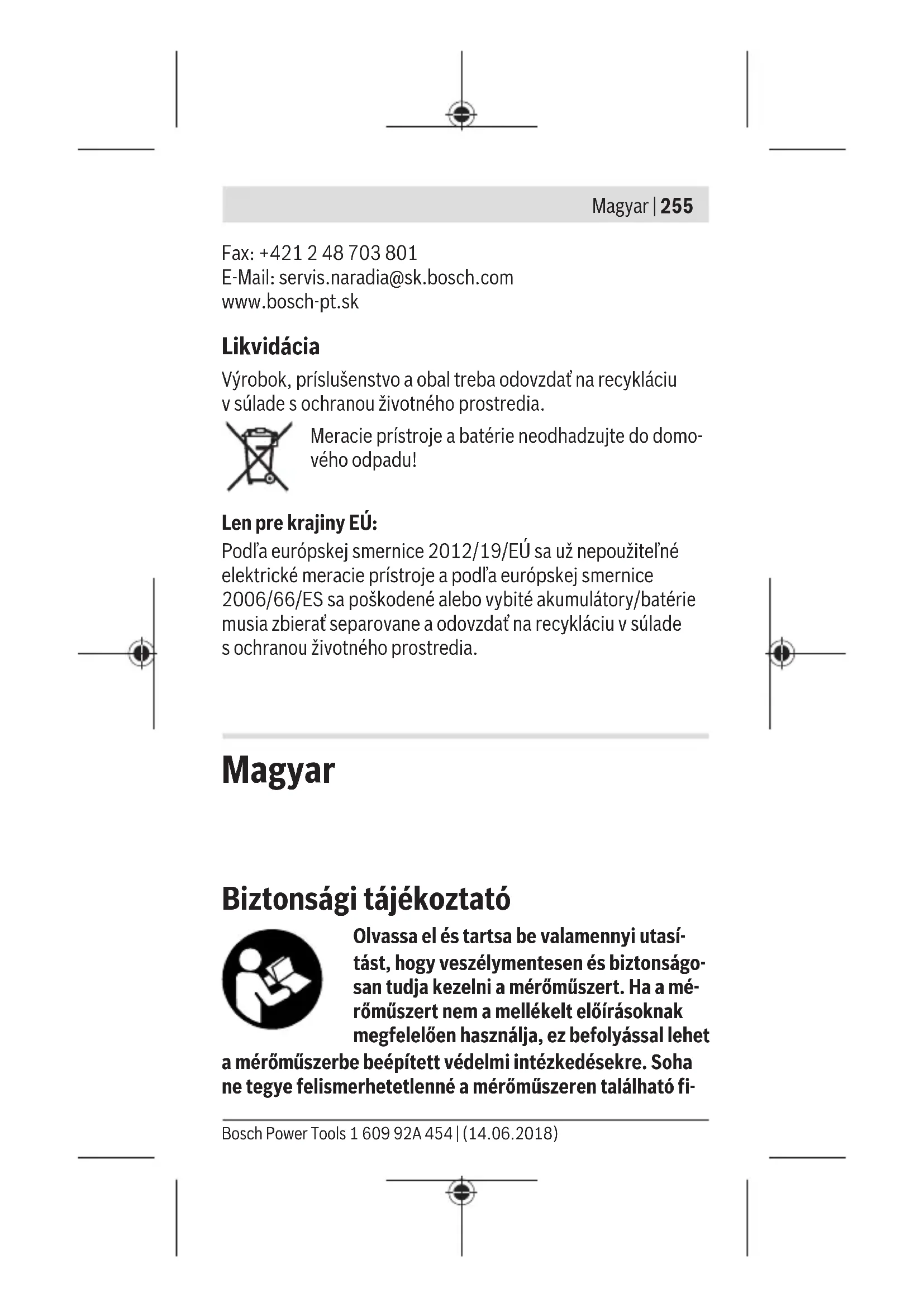 , zobrazí sa hodnota plochy. Údržba aservis Údržba ačistenie Udržiavajte svoj merací prístroj vždy včistote. Neponárajte merací prístroj do vody ani do iných kvapalín. Znečistenia utrite vlhkou mäkkou handričkou. Nepoužívajte žiadne čistiace prostriedky či rozpúšťadlá. Oprijímaciu šošovku(7) sa starajte rovnako svedomito, ako je potrebné zaobchádzať sokuliarmi alebo šošovkou fotoapará- tu. Vprípade potreby opravy, zašlite merací prístroj do servisné- ho strediska. Zákaznícka služba aporadenstvo ohľadom použitia Servisné stredisko vám odpovie na otázky týkajúce sa opravy aúdržby vášho produktu, ako aj náhradných dielov. Rozklado- vé výkresy ainformácie onáhradných dieloch nájdete tiež na: www.bosch-pt.com Vprípade otázok týkajúcich sa našich výrobkov apríslušenstva vám ochotne pomôže poradenský tím Bosch. Vprípade akýchkoľvek otázok aobjednávok náhradných súčiastok uvádzajte bezpodmienečne 10‑miestne vecné číslo uvedené na typovom štítku výrobku. Slovakia Na www.bosch-pt.sk si môžete objednať opravu vášho stroja alebo náhradné diely online. Tel.: +421 2 48 703 800Fax: +421 2 48 703 801 E-Mail: servis.naradia@sk.bosch.com www.bosch-pt.sk Likvidácia Výrobok, príslušenstvo aobal treba odovzdať na recykláciu vsúlade sochranou životného prostredia. Meracie prístroje abatérie neodhadzujte do domo- vého odpadu! Len pre krajinyEÚ: Podľa európskej smernice 2012/19/EÚ sa už nepoužiteľné elektrické meracie prístroje apodľa európskej smernice 2006/66/ES sa poškodené alebo vybité akumulátory/batérie musia zbierať separovane aodovzdať na recykláciu vsúlade sochranou životného prostredia. Magyar Biztonsági tájékoztató Olvassa el és tartsa be valamennyi utasí- tást, hogy veszélymentesen és biztonságo- san tudja kezelni a mérőműszert. Ha a mé- rőműszert nem a mellékelt előírásoknak megfelelően használja, ez befolyással lehet a mérőműszerbe beépített védelmi intézkedésekre. Soha ne tegye felismerhetetlenné a mérőműszeren található fi- Magyar | 255 Bosch Power Tools 1 609 92A 454 | (14.06.2018)256 | Magyar 1 609 92A 454 | (14.06.2018) Bosch Power Tools gyelmeztető táblákat. BIZTOS HELYEN ŐRIZZE MEG EZE- KET AZ UTASÍTÁSOKAT, ÉS HA A MÉRŐMŰSZERT TOVÁBB- ADJA, ADJA TOVÁBB EZEKET AZ UTASÍTÁSOKAT IS. u Ne dolgozzon a mérőműszerrel olyan robbanásveszé- lyes környezetben, ahol éghető folyadékok, gázok vagy porok vannak. A mérőműszer szikrákat kelthet, amelyek a port vagy a gőzöket meggyújthatják. u A mérőműszer egy figyelmeztető táblával kerül kiszállításra (ez a mérőműszernek az ábrák oldalán látható ábráján van jelölve). u Ha a figyelmeztető tábla szövege nem az Ön országában használatos nyelven van írva, akkor ragassza azt le az első üzembevétel előtt az Ön országában használatos nyelven írt öntapadós figyelmeztető táblával. Ne irányítsa a lézersugarat más személyek- re vagy állatokra és saját maga se nézzen bele sem a közvetlen, sem a visszavert lé- zersugárba. Ellenkező esetben a személyeket elvakíthatja, baleseteket okozhat és megsért- heti az érintett személy szemét. u Ha a szemét lézersugárzás éri, csukja be a szemét és lépjen azonnal ki a lézersugár vonalából. u Ne hajtson végre a lézerberendezésen semmiféle vál- toztatást. u Ne hagyja a bekapcsolt mérőműszert felügyelet nélkül és a használat befejezése után kapcsolja ki azt. A lézer- sugár más személyeket elvakíthat. u A mérőműszert csak szakképzett személyzettel és csak eredeti pótalkatrészek felhasználásával javíttassa. Ez biztosítja, hogy a mérőműszer biztonságos berendezés ma- radjon.u Ne hagyja, hogy gyerekek felügyelet nélkül használják a lézeres mérőműszert. Azok más személyeket akaratlanul is elvakíthatnak. u A lézer keresőszemüveget ne használja védőszemüveg- ként. A lézer keresőszemüveg a lézersugár felismerésének megkönnyítésére szolgál, de a lézersugártól nem véd. u A lézer keresőszemüveget ne használja napszemüveg- ként, vagy a közúti közlekedéshez. A lézer keresőszem- üveg nem nyújt teljes védelmet az ultraibolya sugárzás ellen és csökkenti a színfelismerési képességet. u Vigyázat – ha az itt megadottól eltérő kezelő vagy sza- bályozó berendezéseket, vagy az itt megadottaktól elté- rő eljárást használ, ez veszélyes sugársérülésekhez ve- zethet. A termék és a teljesítmény leírása Rendeltetésszerű használat Digitális lézeres távolságmérő A mérőműszer távolságok, hosszúságok és magasság mérésé- re és felületek kiszámítására szolgál. A mérőműszer helyisé- gekben végzett mérésekre alkalmas. Lézervonal-adapter A lézervonal-adapter a Zamo digitális lézeres távolságmérővel beltéri területeken tárgyak (például képek) függőleges vagy vízszintes beállítására szolgál. Szalag-adapter A szalag-adapter a Zamo digitális lézeres távolságmérővel bel- téri területeken kerületek mérésére (például vázák, csövek stb.) és szabadon álló tárgyak (például televízió, polc stb.) hosszának a megmérésére szolgál. Magyar | 257 Bosch Power Tools 1 609 92A 454 | (14.06.2018)258 | Magyar 1 609 92A 454 | (14.06.2018) Bosch Power Tools Kerék-adapter A kerék-adapter a Zamo digitális lézeres távolságmérővel bel- téri területeken két pont közötti útszakaszok hosszának (pél- dául egy textilanyag hosszának) a mérésére szolgál. Az ábrázolásra kerülő komponensek Az ábrázolt alkatrészek sorszámozása megfelel a mérőműszer ábrájának az ábrákat tartalmazó oldalon. (1) Mérő gomb (2) Kijelző (3) Akkumulátorfiókfedél (4) Az akkumulátorfiókfedél reteszelése (5) Gyári szám (6) Lézer figyelmeztető tábla (7) Vevő lencse (8) A lézersugár kilépési 