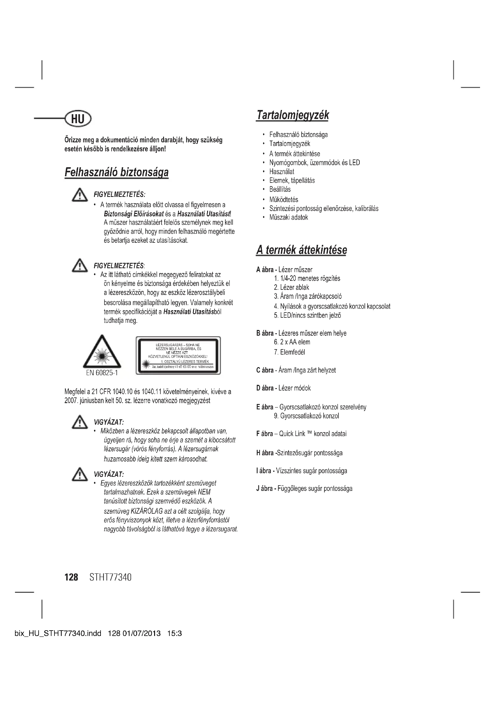 Max.leadottteljesítmény:≤1mW,630–670nm-es hullámhosszon EN 60825-1 Megfelela21CFR1040.10és1040.11követelményeinek,kivévea 2007.júniusbankelt50.sz.lézerrevonatkozómegjegyzést VIGYÁZAT: