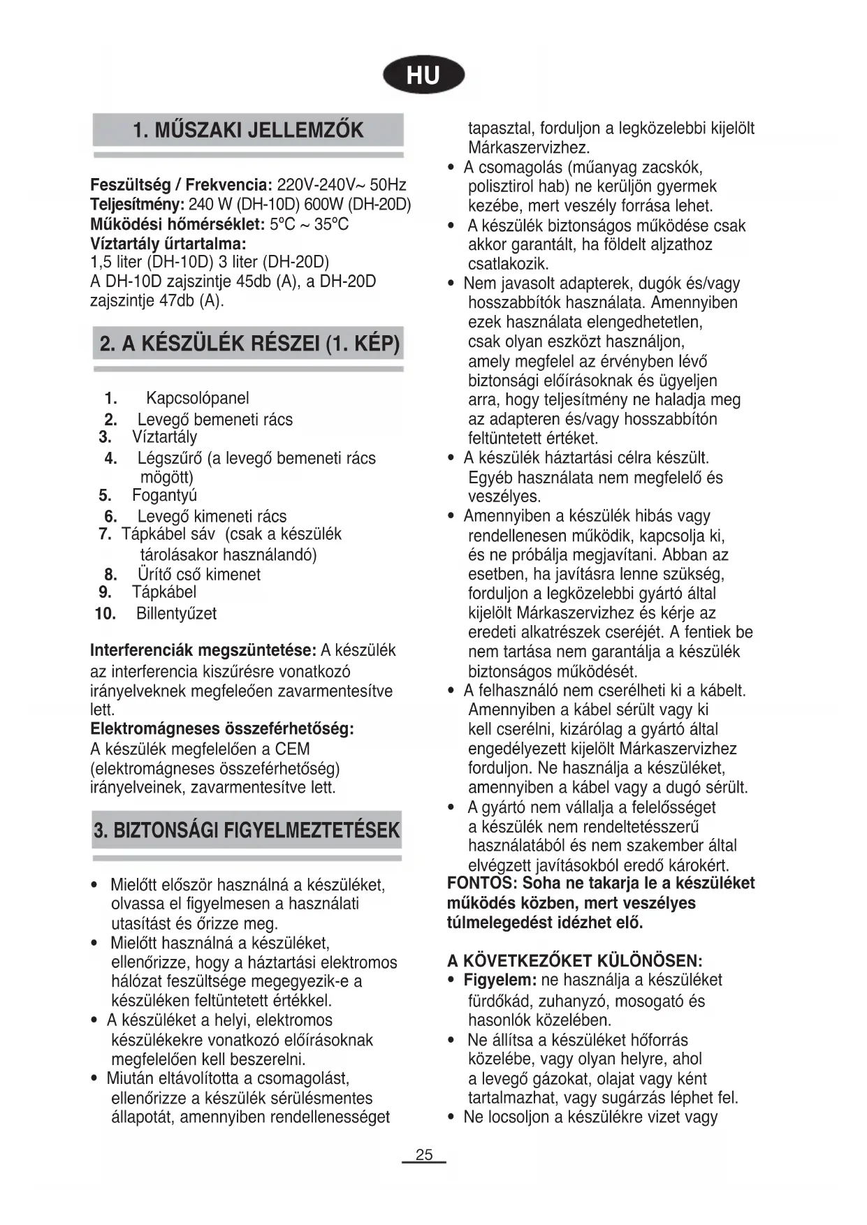Interferenciák megszüntetése: A készülék az interferencia kiszűrésre vonatkozó irányelveknek megfeleően zavarmentesítve lett. Elektromágneses összeférhetőség: A készülék megfelelően a CEM (elektromágneses összeférhetőség) irányelveinek, zavarmentesítve lett. Feszültség / Frekvencia: 220V-240V~ 50Hz Teljesítmény: 240 W (DH-10D) 600W (DH-20D) Működési hőmérséklet: 5ºC ~ 35ºC Víztartály űrtartalma: 1,5 liter (DH-10D) 3 liter (DH-20D) A DH-10D zajszintje 45db (A), a DH-20D zajszintje 47db (A).