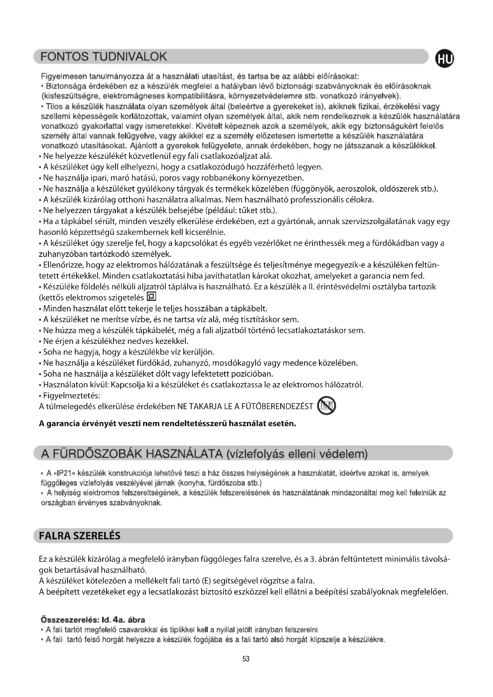 - Figyelmeztetés: A túlmelegedés elkerülése érdekében NE TAKARJA LE A FŰTŐBERENDEZÉST A garancia érvényét veszti nem rendeltetésszerű használat esetén.