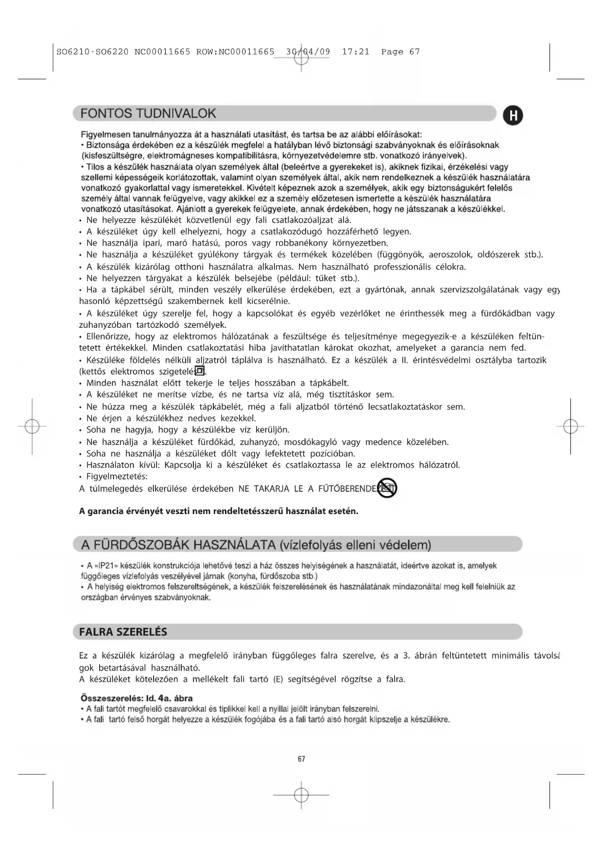Ez a készülék kizárólag a megfelelő irányban függőleges falra szerelve, és a 3. ábrán feltüntetett minimális távolsá- gok betartásával használható. A készüléket kötelezően a mellékelt fali tartó (E) segítségével rögzítse a falra. SO6210-SO6220 NC00011665 ROW:NC00011665 30/04/09 17:21 Page 6768