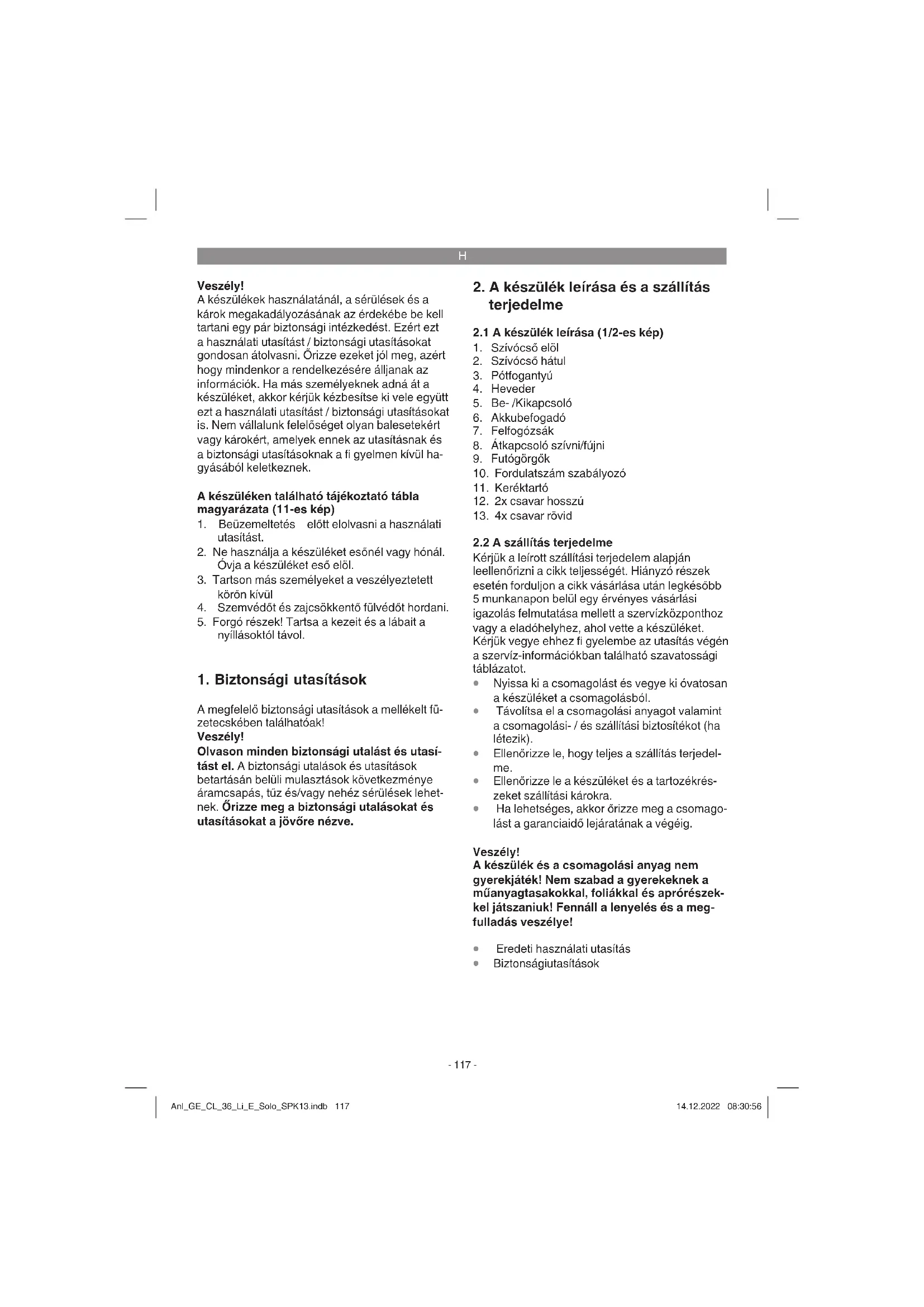 újrahasznosítás A szállítási károk megakadályozásához a készü- lék egy csomagolásban található. Ez a csoma- golás nyersanyag és ezáltal ismét felhasználható vagy pedig visszavezethető a nyersanyagi körforgáshoz. A készülék és annak a tartozé- kai különböző anyagokból állnak, mint például fémből és műanyagokból. Defektes készülékek nem tartoznak a házi hulladékok közé. Szakszerű megsemmisítéshez le kellene adni a készüléket egy megfelelő gyűjtőhelyen. Ha nem ismer gyűjtőhelyeket, akkor érdeklődjön ütánna a köz- ségi önkormányzatnál. Anl_GE_CL_36_Li_E_Solo_SPK13.indb 120Anl_GE_CL_36_Li_E_Solo_SPK13.indb 120 14.12.2022 08:30:5714.12.2022 08:30:57H