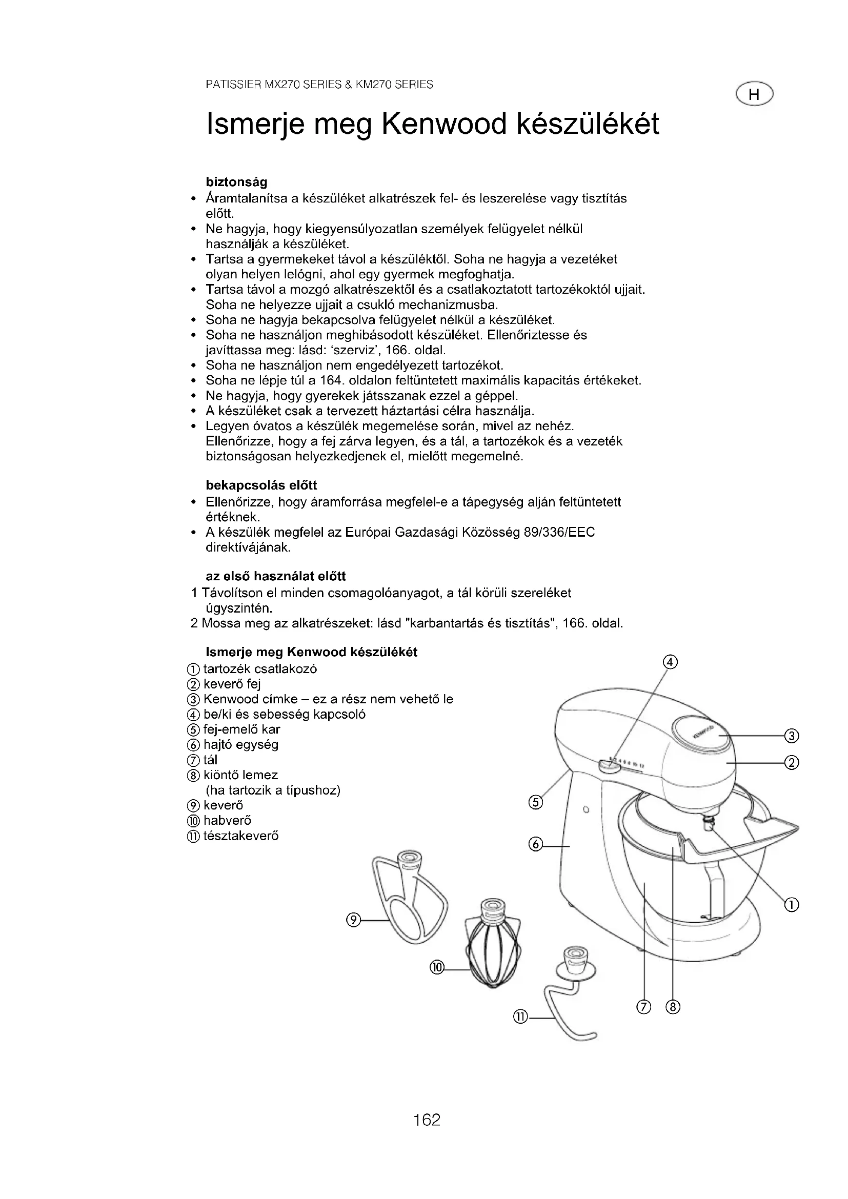 A készülék megfelel az Európai Gazdasági Közösség 89/336/EEC direktívájának. az első használat előtt 1 Távolítson el minden csomagolóanyagot, a tál körüli szereléket úgyszintén. 2 Mossa meg az alkatrészeket: lásd "karbantartás és tisztítás", 166. oldal. Ismerje meg Kenwood készülékét tartozék csatlakozó keverő fej Kenwood címke – ez a rész nem vehető le be/ki és sebesség kapcsoló fej-emelő kar hajtó egység tál kiöntő lemez (ha tartozik a típushoz) keverő habverő tésztakeverő