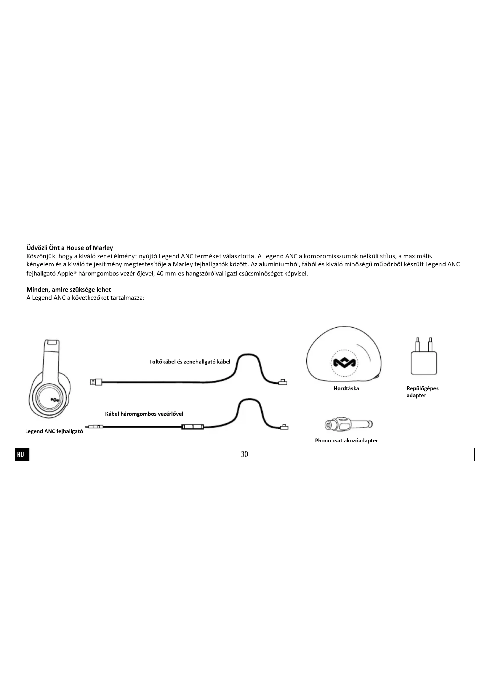 Üdvözli Önt a House of Marley Köszönjük, hogy a kiváló zenei élményt nyújtó Legend ANC terméket választoa. A Legend ANC a kompromisszumok nélküli slus, a maximális kényelem és a kiváló teljesítmény megtestesítője a Marley fejhallgatók közö. Az alumíniumból, fából és kiváló minőségű műbőrből készült Legend ANC fejhallgató Apple® háromgombos vezérlőjével, 40 mm-es hangszóróival igazi csúcsminőséget képvisel. Minden, amire szüksége lehet A Legend ANC a következőket tartalmazza: Legend ANC fejhallgató Kábel háromgombos vezérlővel Töltőkábel és zenehallgató kábel Hordtáska Phono csatlakozóadapter Repülőgépes adapter31 A Legend ANC jellemzői A Legend ANC fejhallgatót ki- és bekapcsolt ANC funkcióval is használhatja. Az akv zajszűrő funkció bekapcsolásához nyomja felső állásba a jobb fülrészen lévő kapcsolót. Kigyullad a lámpa, jelezve, hogy az ANC akv. A Legend ANC fejhallgatóban lévő technológia akvan kiszűri a nemkívánatos külső zajokat, miközben erőteljes és részletgazdag hangzást biztosít. A bekapcsolás során az akkumulátorjelző LED-je kigyullad, így jelezve a töltöséget. Az eszköz feltöltése A Legend ANC feltöltéséhez használja a mellékelt töltőkábelt vagy bármely szabványos Micro-USB kábelt. Az eszköz a számítógép USB- portjáról vagy USB-töltőadapterről is tölthető. Az akkumulátor cseréje A Legend ANC akkumulátort tartalmaz, amit úgy terveztek, hogy kitartson a termék teljes éleartamáig. Ha mégis szüksége lenne csereakkumulátorra, lépjen kapcsolatba az Ügyfélszolgálaal, ahol tájékoztatást adnak a jótállásban foglalt és a jótálláson kívül eső akkumulátorcserével kapcsolatban. Mikrofon kompabilitása, és háromgombos vezérlő Az integrált mikrofon segítségével kihangosíto beszélgetést folytathat. A hívás fogadásához nyomja meg a gombot; a befejezéshez nyomja meg ismét a gombot. A képen látható nyomon követési és lejátszási/ szüneteltetési funkciók csak az Apple eszközökkel működnek. x1 x1