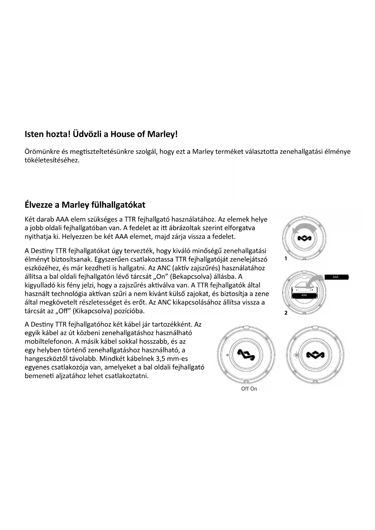x3Ez a jeloles azt jelzi, hogy ezt a termeket az Europai Unioban nem szabad a haztartasi hulladek koze dobni. Az ellenőrizetlen hulladek kezelesből szarmazo kornyeze vagy egeszsegugyi kar elkerulese vege, es a targyi keszletek fenntarthato kezelese jegyeben felelőssegteljesen hasznositsa ujra. A hasznalt eszkoz visszakuldesehez kerjuk, hasznalja a visszakuldő es gyűjtő rendszereket, vagy lepjen kapcsolatba azzal a forgalmazoval, ahonnan a keszuleket vasarolta. A termeket ezek a szolgaltatok kornyezetvedelmileg biztos ujrahasznosito helyre viszik. Két éves korlátozo garancia A The House Of Marley, LLC a termék vásárlásától számíto két évig garantálja annak mentességét anyag- és megmunkálásbeli hibáktól. A kivételek az alábbiakban vannak feltüntetve. A The House Of Marley termékgaranciája nem vonatkozik a helytelen használat és a rossz kezelés által okozo károkra; a balesetekre; a nem hivatalos kiegészítők csatlakoztatására; a termék módosítására; valamint semmilyen más olyan körülményre, amely nem a The House Of Marley cégtől függ. A garancia csak akkor érvényes, ha a terméket az Egyesült Királyságban vagy Európában vásárolták és üzemeltek. A garancia nem vonatkozik olyan termékekre, amelyeket módosítani vagy adaptálni kell ahhoz, hogy más országban is működjenek, mint amelyikhez tervezték, gyártoák, jóváhagyták és/vagy engedélyezték, valamint nem vonatkozik olyan termékek javítására sem, amelyek ilyen jellegű módosítás mia károsodtak. A The House Of Marley, LLC nem felelős semmilyen előre nem láto, következményes vagy különleges kárért. Amennyiben garanciális szervizelésre van szüksége a termékkel kapcsolatban, a dátumot tartalmazó nyugtával (a vásárlás bizonyítékaként) keresse fel a kereskedőt, akinél a terméket vee. Az átvételkor a kereskedő megjavítja vagy kicseréli a terméket. Ha nem tud elmenni az üzletbe, kérjük, forduljon a The House Of Marley ügyfélszolgálatához a +44 203 441 1885 telefonszámon vagy a CS@thehouseofmarley.co.uk e-mail címen. The House Of Marley PO Box 460, Tonbridge Kent TN9 9EW, UK Ha a terméket nem a The House Of Marley egyik viszonteladójával szervizelte, a garancia érvényét vesz. Ez a garancia nem befolyásolja az Ön jogszabály által előírt jogait. A termékvonalainkkal kapcsolatos további információért keresse fel a www.thehouseofmarley.com webhelyet Minden jog fenntartva. WEEE-MAGYARAZATVítejte v prostředí House of Marley Je nám potěšením a c, že jste si vybrali tento produkt Marley, aby se stal součás vašeho hudebního světa. Užijte si sluchátka Marley! Používání sluchátek TTR vyžaduje dvě baterie typu AAA. Baterie se nachází uvnitř pravého sluchátka. Otočením kryt sejměte (viz obrázek). Vložte dvě baterie typu AAA a poté znovu nasaďte kryt. Sluchátka Desny TTR jsou navrženy tak, aby zajišťovaly nejvyšší kvalitu zvuku. Stačí připojit sluchátka TTR k hudebnímu zařízení a ponořit se do poslechu. Chcete-li využívat funkci akvního potlačení hluku ANC, otočte volič na vnější straně levého sluchátka do polohy Zapnuto (On). Rozsví se malá kontrola, která značí, že je funkce akvní. Technologie sluchátek TTR akvně ruší nežádoucí venkovní hluk a zároveň zajišťuje úroveň detailů a výkon, jaké si vaše hudba zaslouží. Funkci ANC můžete deakvovat otočením voliče zpět do polohy Vypnuto (O). Sluchátka Desny TTR jsou dodávána se dvěma kabely. Jeden kabel je určen k používání během poslechu na cestách a při používání mobilního telefonu. Druhý kabel je mnohem delší a slouží k poslechu na místě, když se nacházíte ve větší vzdálenos od zvukového zařízení. Každý kabel má rovný 3,5mm konektor, který lze připojit ke vstupnímu konektoru v dolní čás levého sluchátka. “O” Position “On” Position Off On AAA AAA