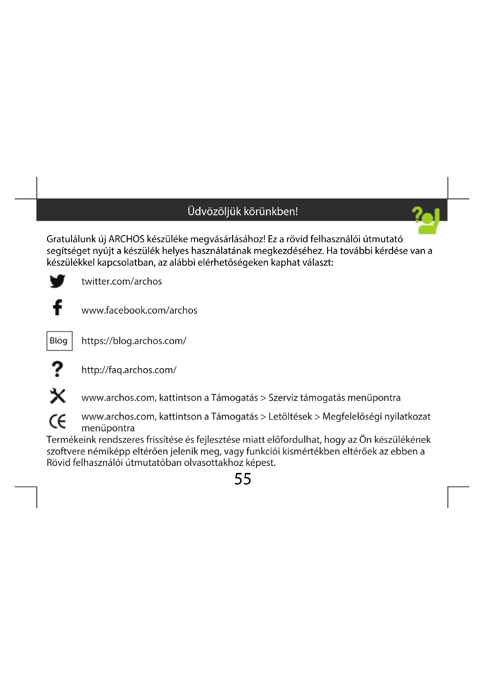 A magánhálózatok mellett lakat szimbólum látható, és jelszó megadását kérik. Indítás60 - Saját készülék lefagyott: nyomja meg az ON / OFF gombot több mint 10 másodpercig, vagy cserélje ki az akkumulátort, majd kapcsolja be a készüléket. - Saját eszköz találkozik zavarok: menjen a Beállítások> A telefonról> Frissítések rendszer ellenőrzi a frissítéseket. Ha az eszköz up-to-date, próbálja visszaállítani a készüléket a Beállítások> Gyári adatok visszaállítása> Biztonsági mentés és visszaállítás. Javasoljuk, hogy mentse a fájlokat a visszaállítás előtt. - Ha a Wi-Fi jelerősség túl gyenge: győződjön meg arról, hogy nincs túl messze a Wi-Fi hotspottól. Frissítse a készülék rmware-ét: http://www.archos.com/support. Állítsa vissza és állítsa be újra a csatlakozási paramétereket. Forduljon a Wi-Fi szolgáltatóhoz. - Saját eszköz bootlogo játszik a hurok: meg kell, hogy teljesen a készülék újraindítására. Tovább a faq.archos.com és válassza ki az eszközt. Ezen biztonsági mentés és helyreállítás, válassza Hogyan újrainicializál az Archos. MŰSZAKI PROBLÉMÁIRA AZ ALÁBBI CÍMEN IS TALÁLHAT VÁLASZT: FAQ.ARCHOS.COM Hibaelhárítás61 Вітаємо з придбанням пристрою ARCHOS! Цей Короткий посібник користувача допоможе вам почати використовувати пристрій належним чином. Якщо у вас є питання стосовно використання вашого пристрою, відвідайте наші сторінки в Інтернет: twitter.com/archos www.facebook.com/archosukraine Blog https://blog.archos.com/ http://faq.archos.com/ www.archos.com/ua, оберіть Підтримка www.archos.com, оберіть Підтримка > Завантаження > Декларація про відповідність Ми часто оновлюємо і вдосконалюємо нашу продукцію, тому програмне забезпечення вашого пристрою може мати дещо інший вигляд або відрізнятися функціональністю від заявлених в цьому Короткому посібнику користувача. Допомога та підтримка62 Warranty Розпакування ARCHOS 55b Platinum Короткий посібник користувача Гарантія та Вказівки з технічної безпеки Кабель до зарядного