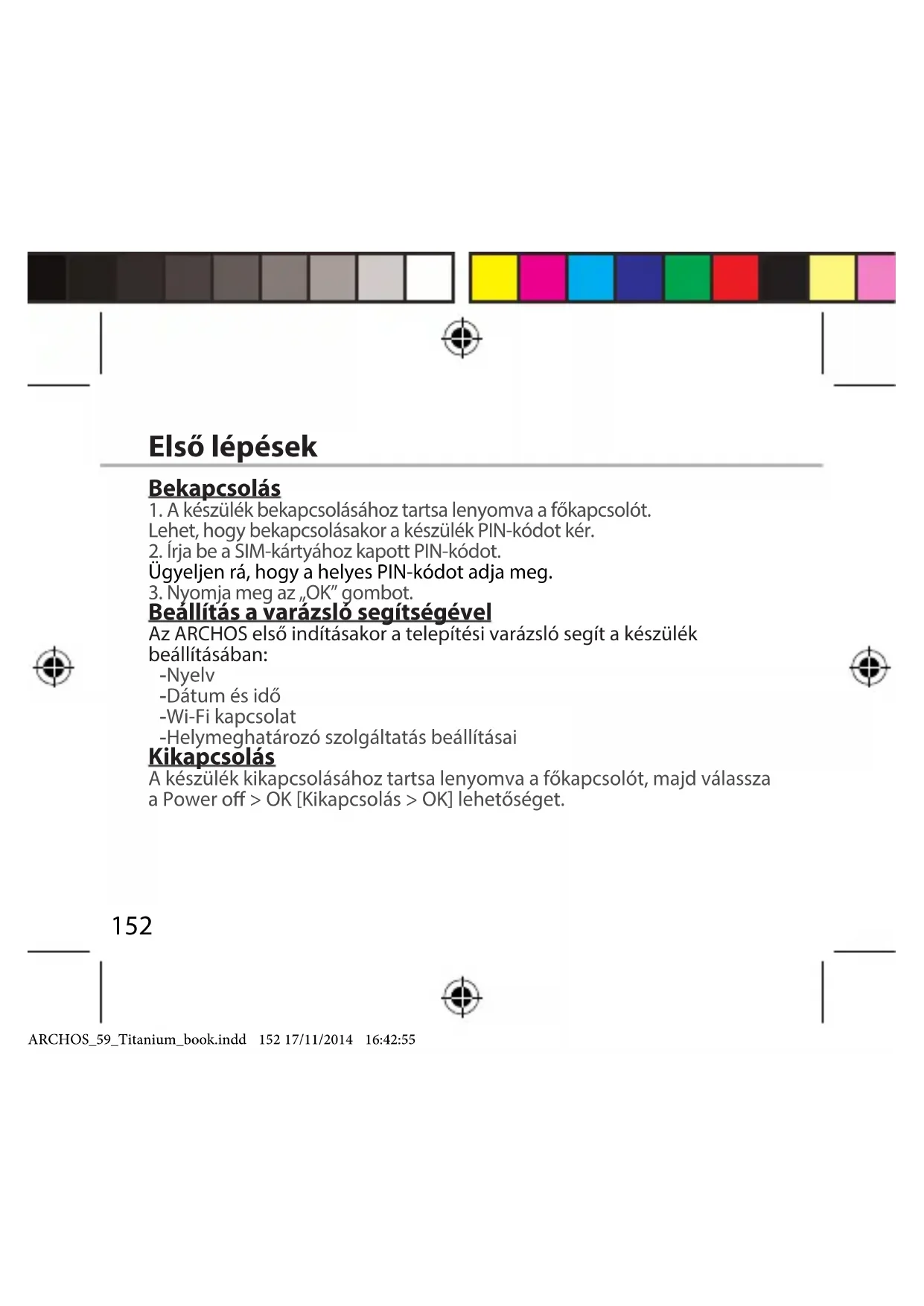 Beállítás a varázsló segítségével Az ARCHOS első indításakor a telepítési varázsló segít a készülék beállításában: - Nyelv - Dátum és idő - Wi-Fi kapcsolat - Helymeghatározó szolgáltatás beállításai Kikapcsolás A készülék kikapcsolásához tartsa lenyomva a főkapcsolót, majd válassza a Power o > OK [Kikapcsolás > OK] lehetőséget. Első lépések ARCHOS_59_Titanium_book.indd 152 17/11/2014 16:42:55153