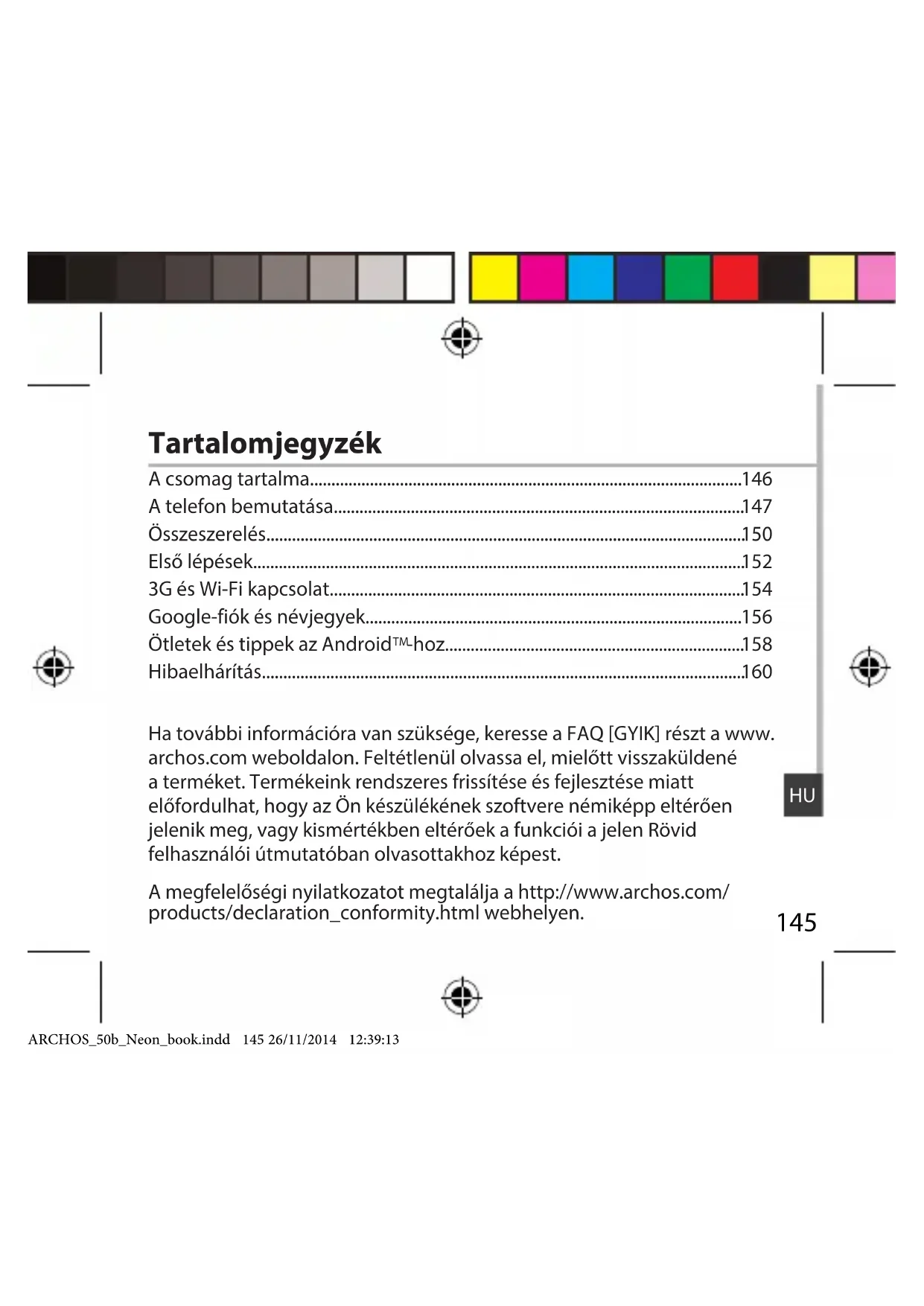 Ha további információra van szüksége, keresse a FAQ [GYIK] részt a www. archos.com weboldalon. Feltétlenül olvassa el, mielőtt visszaküldené a terméket. Termékeink rendszeres frissítése és fejlesztése miatt előfordulhat, hogy az Ön készülékének szoftvere némiképp eltérően jelenik meg, vagy kismértékben eltérőek a funkciói a jelen Rövid felhasználói útmutatóban olvasottakhoz képest. A csomag tartalma..................................................................................................... A telefon bemutatása................................................................................................ Összeszerelés................................................................................................................ Első lépések................................................................................................................... 3G és Wi-Fi kapcsolat................................................................................................. Google-fiók és névjegyek........................................................................................ Ötletek és tippek az Android