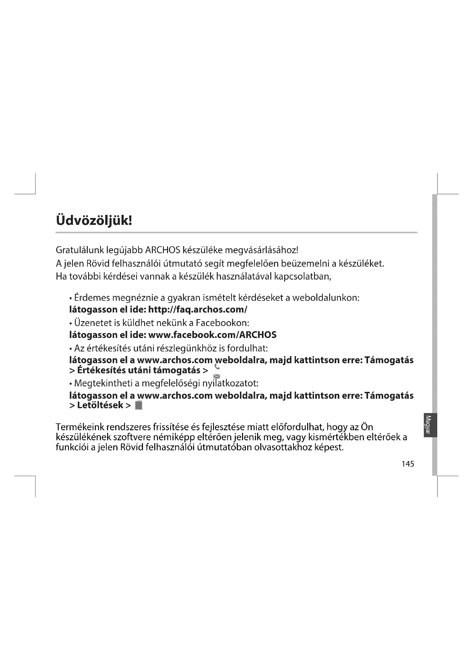 - Az értékesítés utáni részlegünkhöz is fordulhat: látogasson el a www.archos.com weboldalra, majd kattintson erre: Támogatás > Értékesítés utáni támogatás >