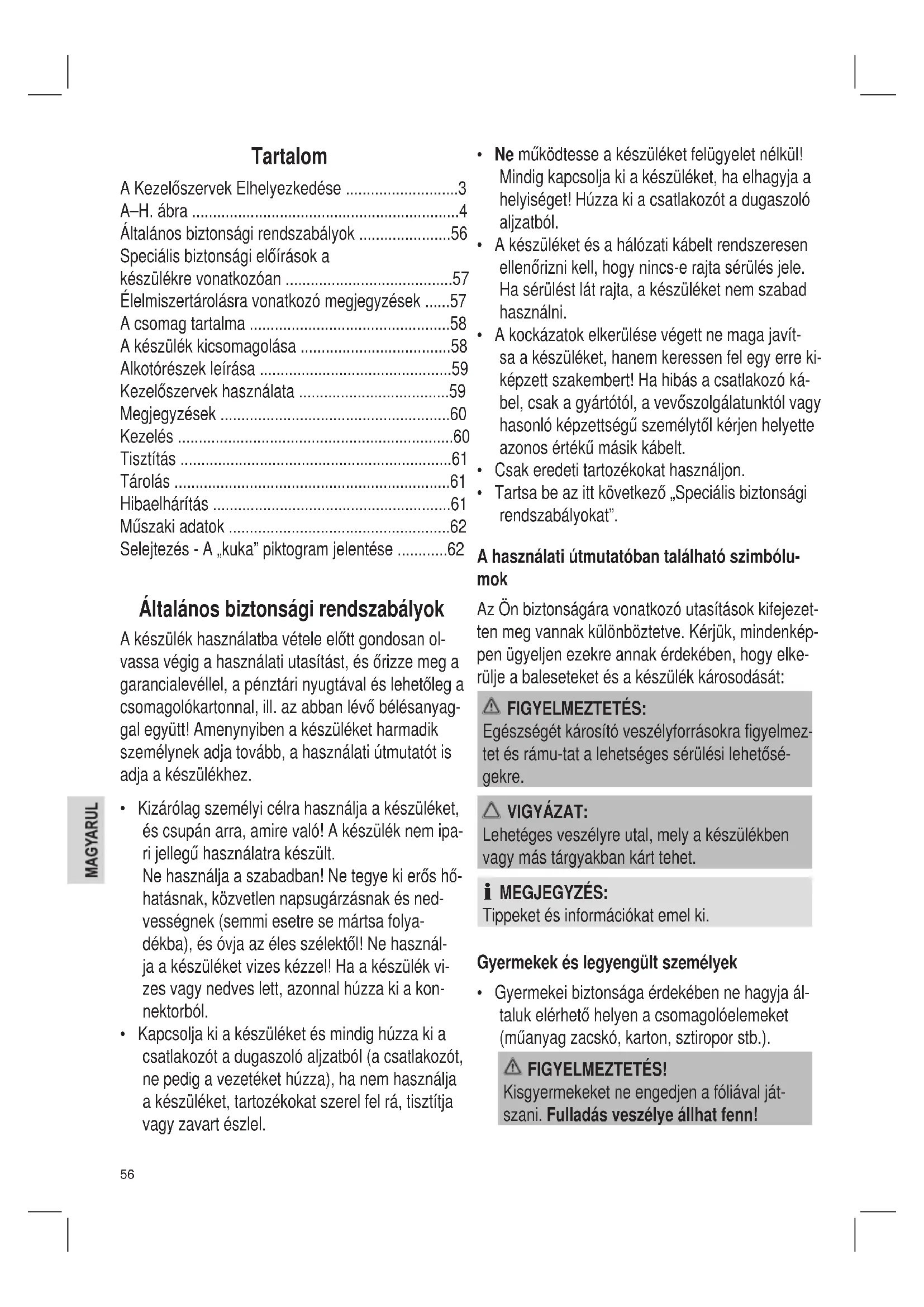 - Gyermekeibiztonságaérdekébennehagyjaál- talukelérhetőhelyenacsomagolóelemeket (műanyag zacskó, karton, sztiropor stb.). FIGYELMEZTETÉS! Kisgyermekeket ne engedjen a fóliával ját- szani. Fulladás veszélye állhat fenn!57