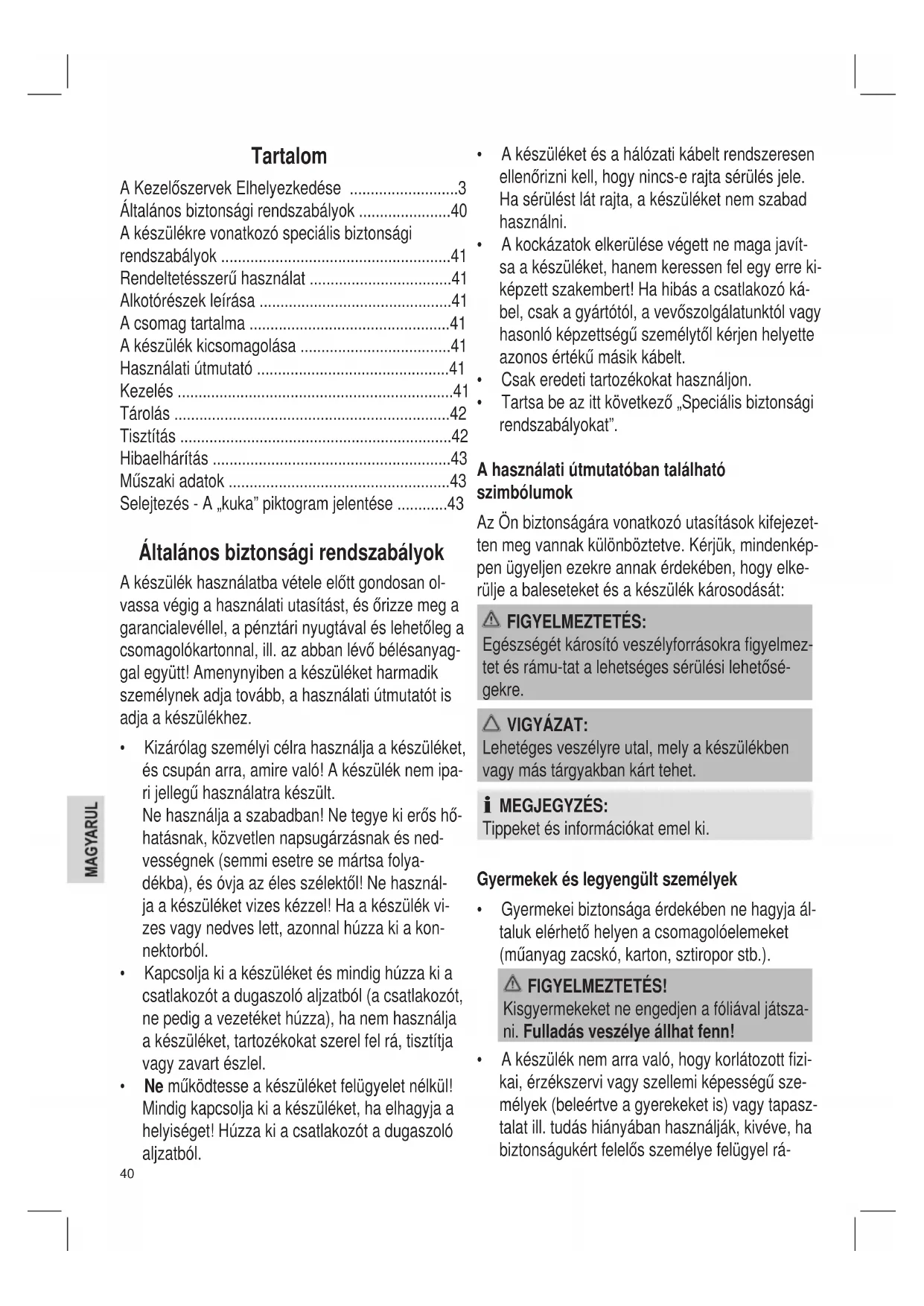 - Akészüléknemarravaló,hogykorlátozottzi- kai,érzékszervivagyszellemiképességűsze- mélyek(beleértveagyerekeketis)vagytapasz- talatill.tudáshiányábanhasználják,kivéve,ha biztonságukértfelelősszemélyefelügyelrá-41 juk vagy utasításokat kaptak arra vonatkozólag, hogyhogyankellhasználniakészüléket.