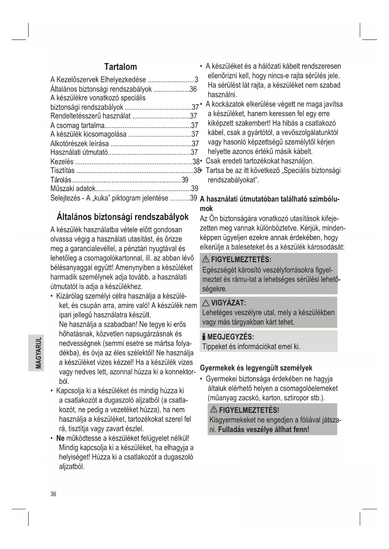 - Gyermekei biztonsága érdekében ne hagyja általuk elérhető helyen a csomagolóelemeket (műanyag zacskó, karton, sztiropor stb.). FIGYELMEZTETÉS! Kisgyermekeket ne engedjen a fóliával játsza- ni. Fulladás veszélye állhat fenn!37