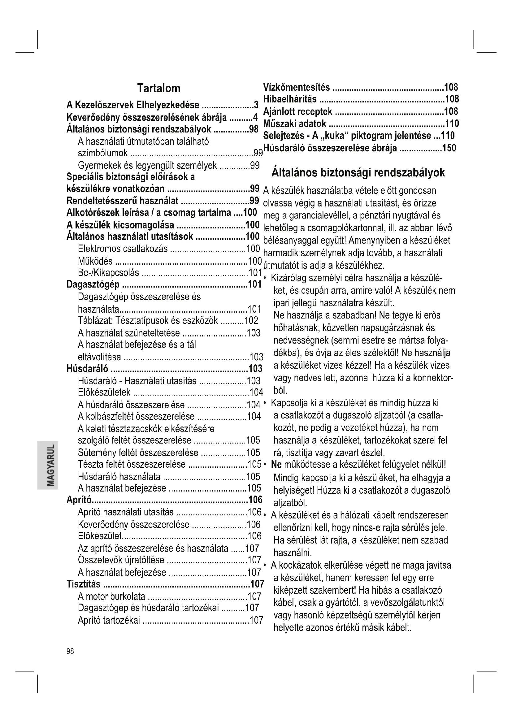 - húsdarálóként élelmiszerek darálására. A tész- tából vagy a dagasztott tésztából a különböző feltétek segítségével formázhat is.100 A készülék kizárólag ezekre a célokra lett kialakít- va, és csak ezeknek megfelelően használható. Csak a használati útmutatóban leírtak szerint használható. A készülék nem használható kereskedelmi célok- ra. Minden más használat nem rendeltetésszerűnek minősül, és anyagi kárt vagy akár személyi sérü- lést is okozhat. A gyártó nem vállal felelősséget a nem rendelte- tésszerű használatból eredő sérülésekre. Alkotórészek leírása / a csomag tartalma A kezelőszervek áttekintése a 3. oldalon: 1 Keverőtartály 2 Forgókar 3 Kar a kar leengedéséhez/felemeléséhez 4 MIXING (keverés) gomb 5 EGG/MILK (tojás/tej) gomb 6 FRUIT JUICE (gyümölcslé) gomb 7 GRINDING (darálás) gomb 8 Vezérlőgomb 9 Motor burkolat 10 Keverőtál 11 Fröccsenésgátló 12 Csatlakozógyűrű 13 Zárógyűrű 14 Csiga ház betöltőnyílás 15 Betöltőtálca 16 Tolórúd 17 A csiga ház csatlakozójának fedele 18 Aprító meghajtójának biztonsági fedele 19 Biztonsági fedél eltávolítása / felhelyezése gomb 20 3 védőlemez 21 Keverőlapát 22 Habverő 23 Dagasztólapát Keverőedény összeszerelésének ábrája a 4. oldalon: 1 Keverőtartály 1a Ütköző 1b Fedél 1c Biztonsági gyűrű 1d Tömítőgyűrű 1e Kés szerelvény 1f Menetes csatlakozó A. – E. ábrák az utolsó oldalon: 24 Csigamenet 25 Kés 26 3 rostély (nom, közepes, durva) 27 Kolbász feltét 28 2-darab „kebbe“ feltét 29 Adapter 30 Sütemény feltétek 31 Sütemény sín 32 4 tésztafeltét (különböző tésztaalakok) A készülék kicsomagolása