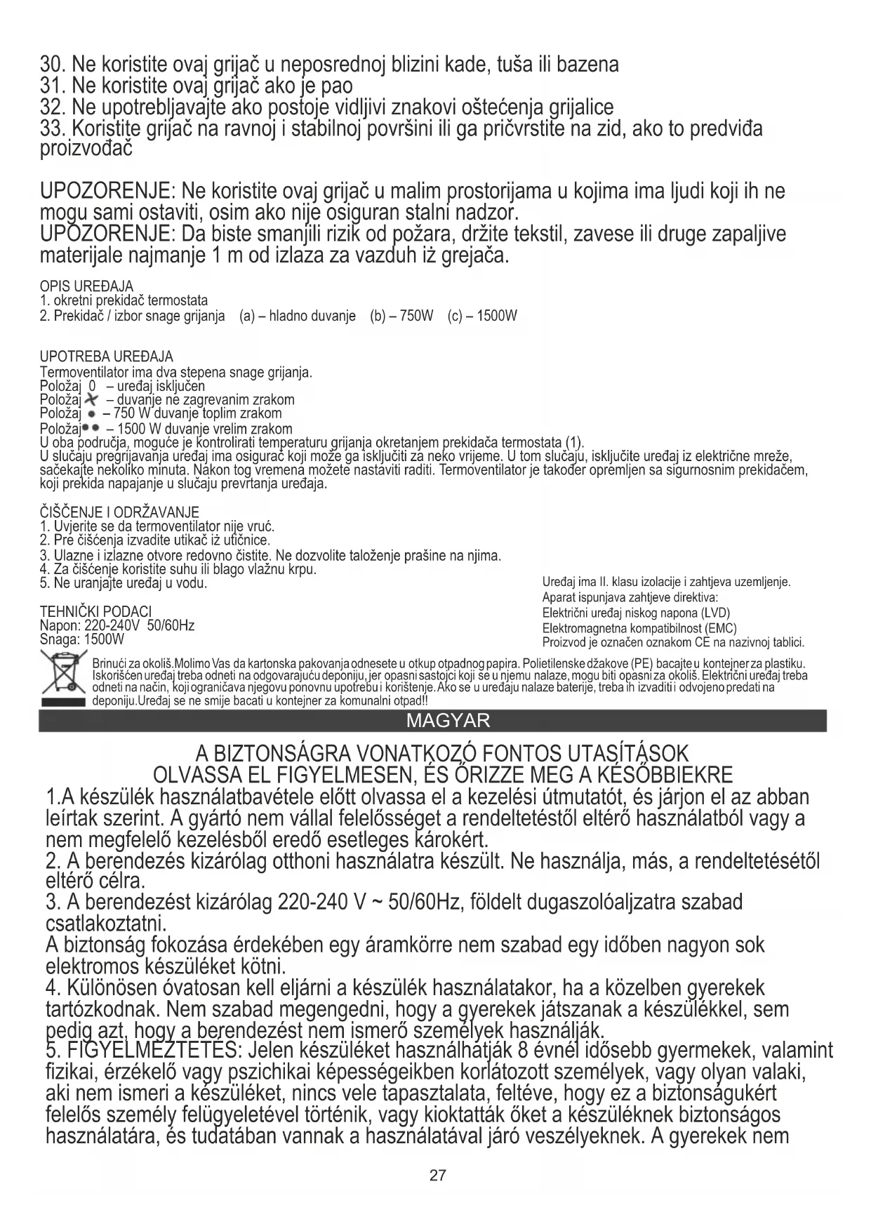 26. a tápkábelt ne tegye a termoventilátor fölé, ne érintkezzen, vagy ne legyen forró felületek