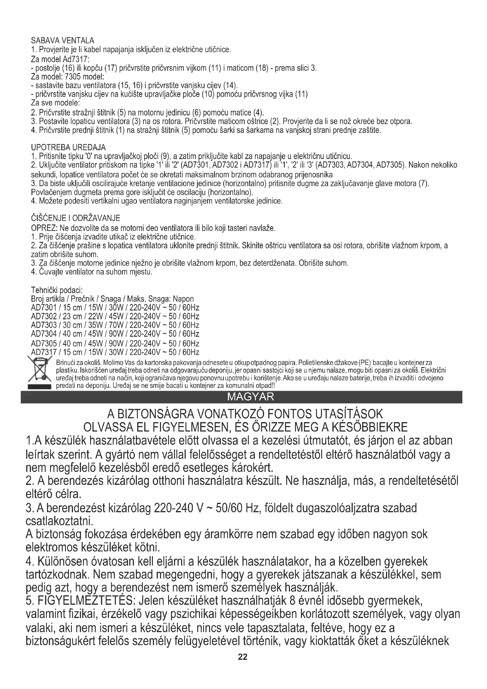 1.Ellenőrizze, hogy a tápkábel ki van-e húzva az elektromos aljzatból. AD7317 modell esetén: - szerelje fel az alapot (16) vagy a kapcsot (17) a rögzítőcsavarral (11) és az anyával (18) - a 3. ábra szerint.24 A környezet védelme érdekében kérjük külön karton dobozok és műanyag zsákokat és dobja őket a megfelelő hulladék közé. Használt készüléket kell eljuttatni a kijelölt gyűjtőhelyekre miatt veszélyes elemek alkatrészeket, amelyek hatással lehetnek a környezetre. Ne dobja a készüléket a közös szemétkosárba. SUOMI