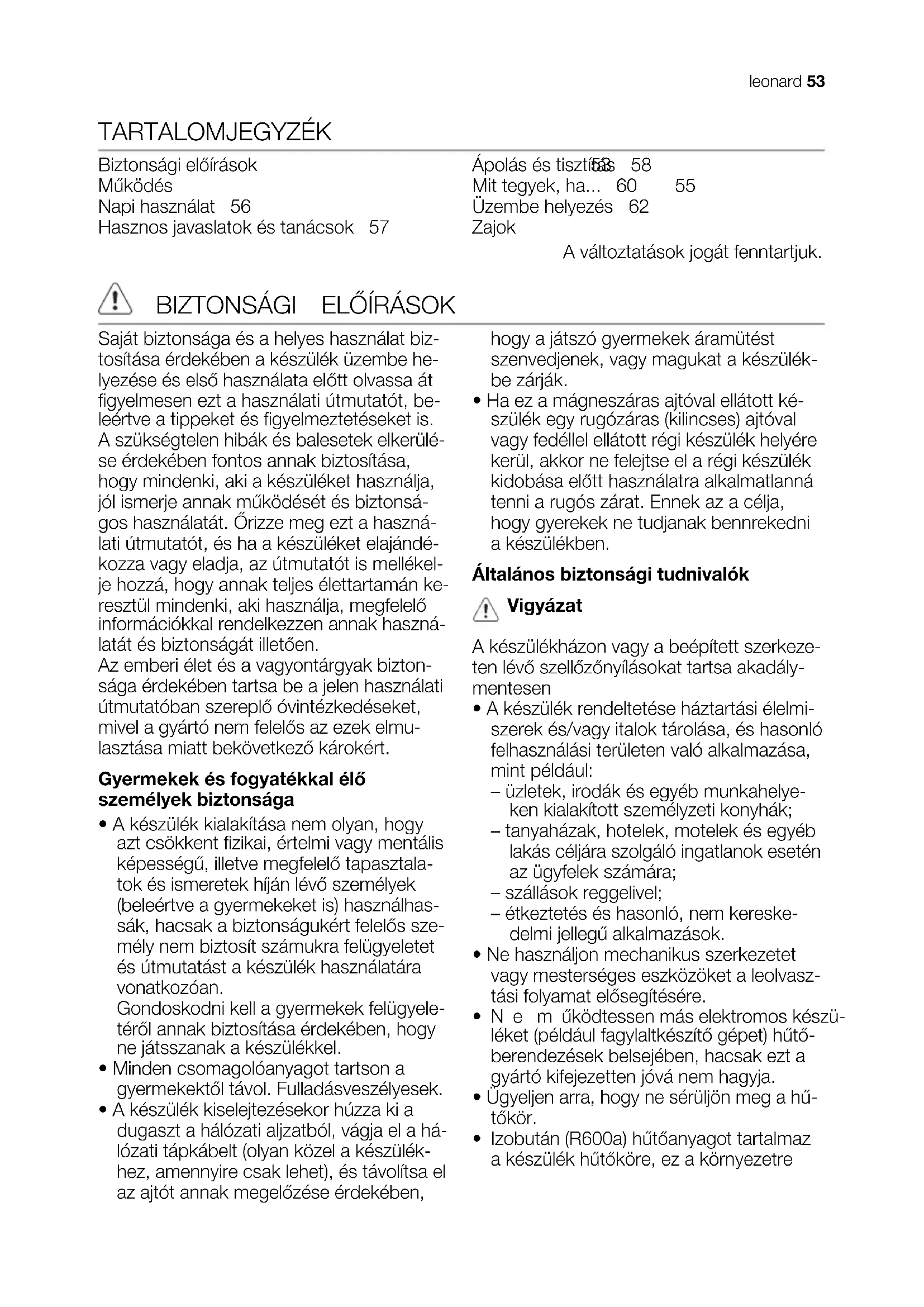 Ez a keszülék sem a hütőfolyadék-keringető rendszerben, sem a szigetelő anyagokban nem tartalmaz az ozonréteget karosító gazokat. A keszüléket nem szabad a lakossági hulladékkal és szeméttel együtt kidobni. A szigetelőhab gyulékony gazokat tartalmaz: a keszüléket a helyi hatóságoktól beszerezhető vonatkozo rendelkezésekkel összhangban kell hulladékba helyezni. Vigyázzon, ne sérüljön meg a hütőegy-seg, különösen hatul a hócserő környéke. A keszüléken hasznalt és szimbólummal megjelöl't anyagok üjrahasznosithatóak.
