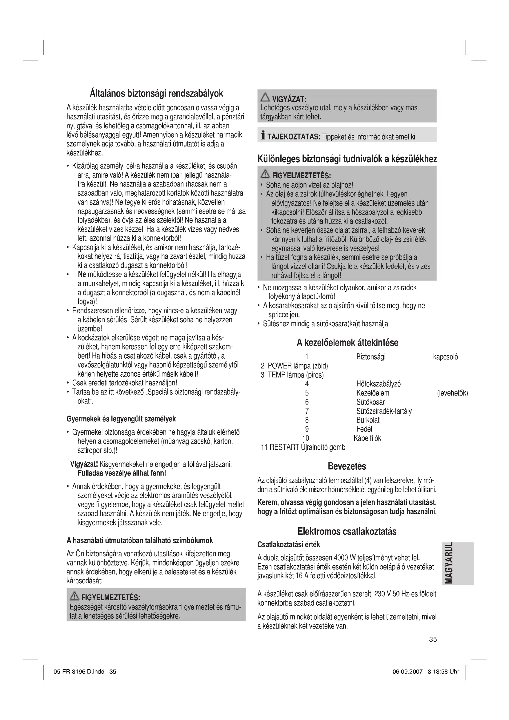 - Sütéshez mindig a sütőkosara(ka)t használja. A kezelőelemek áttekintése 1 Biztonsági kapcsoló 2 POWER lámpa (zöld) 3 TEMP lámpa (piros) 4 Hőfokszabályzó 5 Kezelőelem (levehetők) 6 Sütőkosár 7 Sütőzsiradék-tartály 8 Burkolat 9 Fedél 10 Kábelfi ók 11 RESTART Újraindító gomb Bevezetés Az olajsütő szabályozható termosztáttal (4) van felszerelve, ily mó- don a sütnivaló élelmiszer hőmérsékletét egyénileg be lehet állítani. Kérem, olvassa végig gondosan a jelen használati utasítást, hogy a fritőzt optimálisan és biztonságosan tudja használni. Elektromos csatlakoztatás Csatlakoztatási érték A dupla olajsütőt összesen 4000 W teljesítményt vehet fel. Ezen csatlakoztatási érték esetén két külön betápláló vezetéket javaslunk két 16 A feletti védőbiztosítékkal. A készüléket csak előírásszerűen szerelt, 230 V 50 Hz-es földelt konnektorba szabad csatlakoztatni. Az olajsütő mindkét oldalát egyenként is lehet üzemeltetni, mivel a készüléknek két vezetéke van. 05-FR 3196 D.indd 3505-FR 3196 D.indd 35 06.09.2007 8:18:58 Uhr06.09.2007 8:18:58 Uhr36 MAGYARUL MAGYARUL