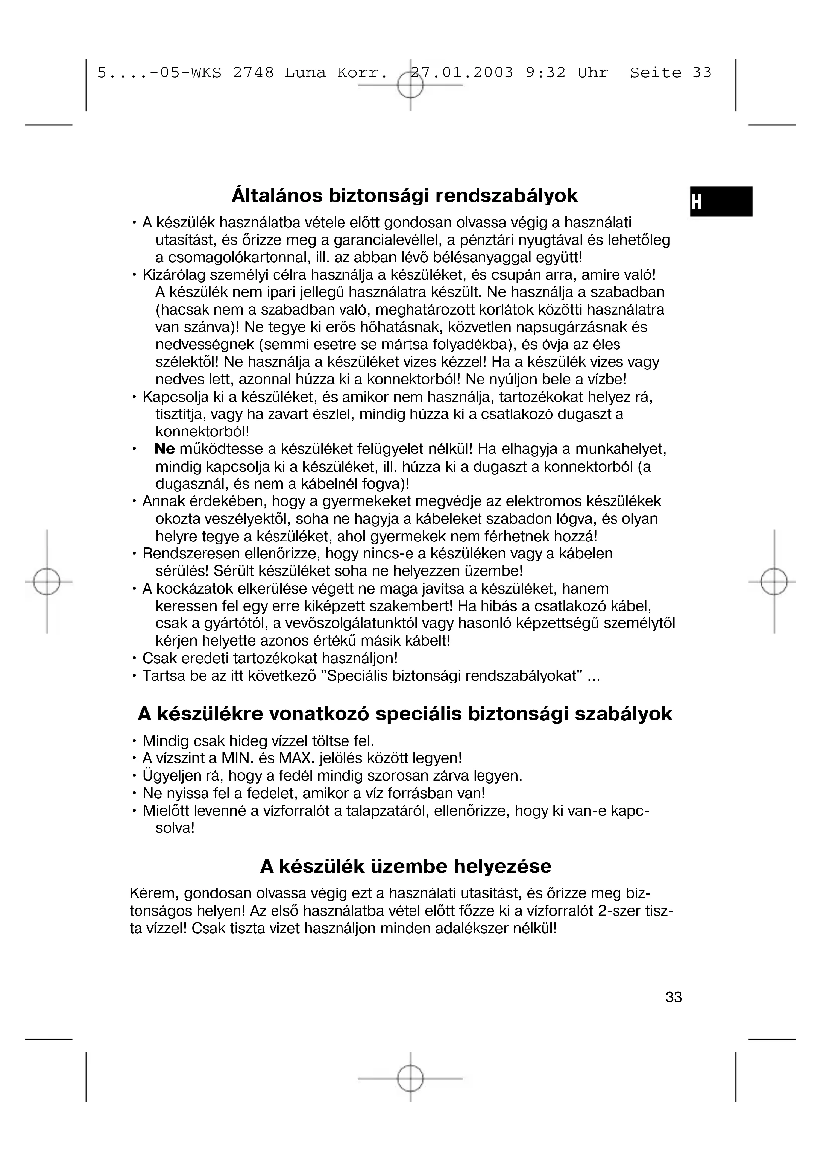 5....-05-WKS 2748 Luna Korr. 27.01.2003 9:32 Uhr Seite 34Ezt a készüléket az Európa Tanács minden vonatkozó aktuális irányelve szerint (pl. elektromágnesesség-elviselő képesség vagy kisfeszültség-elviselő képes- ség) ellenőriztük, és a legújabb biztonságtechnikai előírások szerint készült. Megjegyezzük az esetleges müszaki változásokat! Garancia Az általunk forgalmazott készülékre a vétel időpontjától (pénztári nyugta) számított 24 havi garanciát vállalunk. A garanciális időn belül saját mérlegelésünk szerint javítással vagy cserével díjtalanul megszüntetjük a készülék vagy a tartozék *) olyan hiányosságait, ame- lyek anyaghibára vagy gyártási hibára vezethetők vissza. A garanciális szolgál- tatások sem a garanciális idő meghosszabbítását nem eredményezik, sem nem alapoznak meg újabb garanciára való igényt! A garancia igazolására a pénztári nyugta szolgál. E nélkül az igazolás nélkül sem díjmentes csere, sem díjtalan javítás nem végezhető. Garanciális esetben szíveskedjék az alapkészüléket eredeti csomagolásában a pénztári nyugtával együtt átadni a kereskedőjének! *) A tartozékok a jogszabályban előírt szavatossági kötelezettség (6 hónap) hatálya alá tartoznak, és nem vezetnek az egész készülék díjtalan cseréjére. Ilyen esetben ne a készüléket küldje be, ill. rendelje meg, hanem vevőszolgálatunkkal egyeztetve csak a hibás tartozékot! Az üvegtörés okozta hibák mindig térítéskötelesek! Sem az elhasználódó tartozékokban, ill. kopó alkatrészekben (pl. szénkefe, dagasztóhorog, hajtószíj, póttávvezérlő, pótfogkefe, fűrészlap stb.) bekövetkező hibák, sem a tisztítás, karbantartás vagy a kopó alkatrészek cseréje nem esik a garancia hatálya alá, következésképp térítésköteles. Illetéktelen beavatkozás a garancia megszűnését eredményezi. A garanciális idő után A garanciális idő eltelte után a megfelelő szakkereskedésben vagy javítószol- gálatnál végeztethet térítésköteles javításokat.