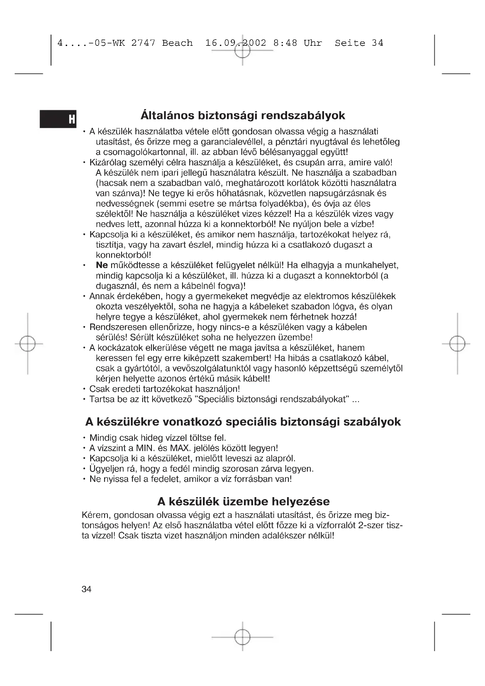 4....-05-WK 2747 Beach 16.09.2002 8:48 Uhr Seite 35Garancia Az általunk forgalmazott készülékre a vétel időpontjától (pénztári nyugta) számított 24 havi garanciát vállalunk. A garanciális időn belül saját mérlegelésünk szerint javítással vagy cserével díjtalanul megszüntetjük a készülék vagy a tartozék *) olyan hiányosságait, ame- lyek anyaghibára vagy gyártási hibára vezethetők vissza. A garanciális szolgál- tatások sem a garanciális idő meghosszabbítását nem eredményezik, sem nem alapoznak meg újabb garanciára való igényt! A garancia igazolására a pénztári nyugta szolgál. E nélkül az igazolás nélkül sem díjmentes csere, sem díjtalan javítás nem végezhető. Garanciális esetben szíveskedjék az alapkészüléket eredeti csomagolásában a pénztári nyugtával együtt átadni a kereskedőjének! *) A tartozékok a jogszabályban előírt szavatossági kötelezettség (6 hónap) hatálya alá tartoznak, és nem vezetnek az egész készülék díjtalan cseréjére. Ilyen esetben ne a készüléket küldje be, ill. rendelje meg, hanem vevőszolgálatunkkal egyeztetve csak a hibás tartozékot! Az üvegtörés okozta hibák mindig térítéskötelesek! Sem az elhasználódó tartozékokban, ill. kopó alkatrészekben (pl. szénkefe, dagasztóhorog, hajtószíj, póttávvezérlő, pótfogkefe, fűrészlap stb.) bekövetkező hibák, sem a tisztítás, karbantartás vagy a kopó alkatrészek cseréje nem esik a garancia hatálya alá, következésképp térítésköteles. Illetéktelen beavatkozás a garancia megszűnését eredményezi. A garanciális idő után A garanciális idő eltelte után a megfelelő szakkereskedésben vagy javítószol- gálatnál végeztethet térítésköteles javításokat.