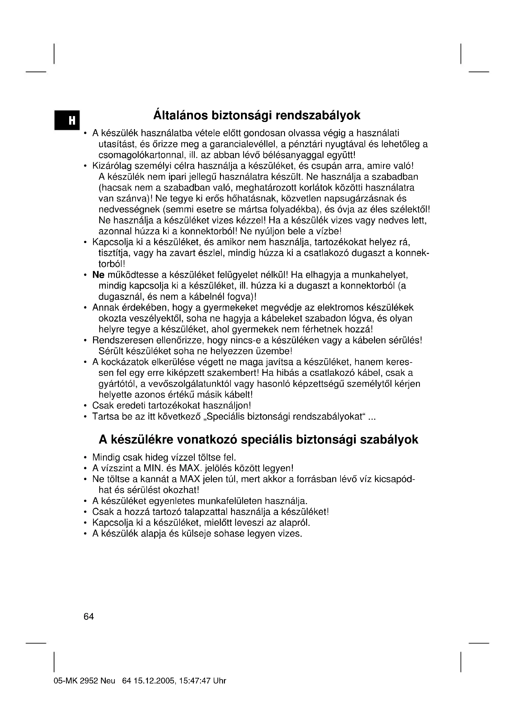 - A készülék alapja és külseje sohase legyen vizes. 05-MK 2952 Neu 64 15.12.2005, 15:47:47 UhrH