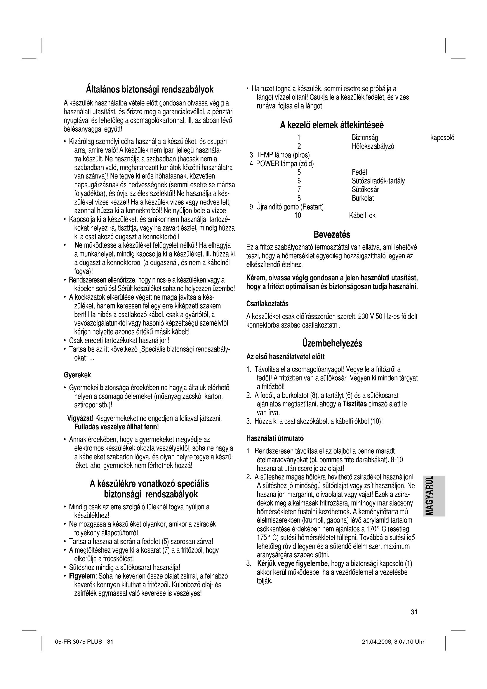 - Csak a készülék teljes lehűlése után működtesse a vezérlőelem hátoldalán található „RESTART“ gombot (9), ha a fritőzt újra használni szeretné. A gomb megnyomásához használjon valamilyen hegyes tárgyat. 05-FR 3075 PLUS 32 21.04.2006, 8:07:12 UhrMAGYARUL