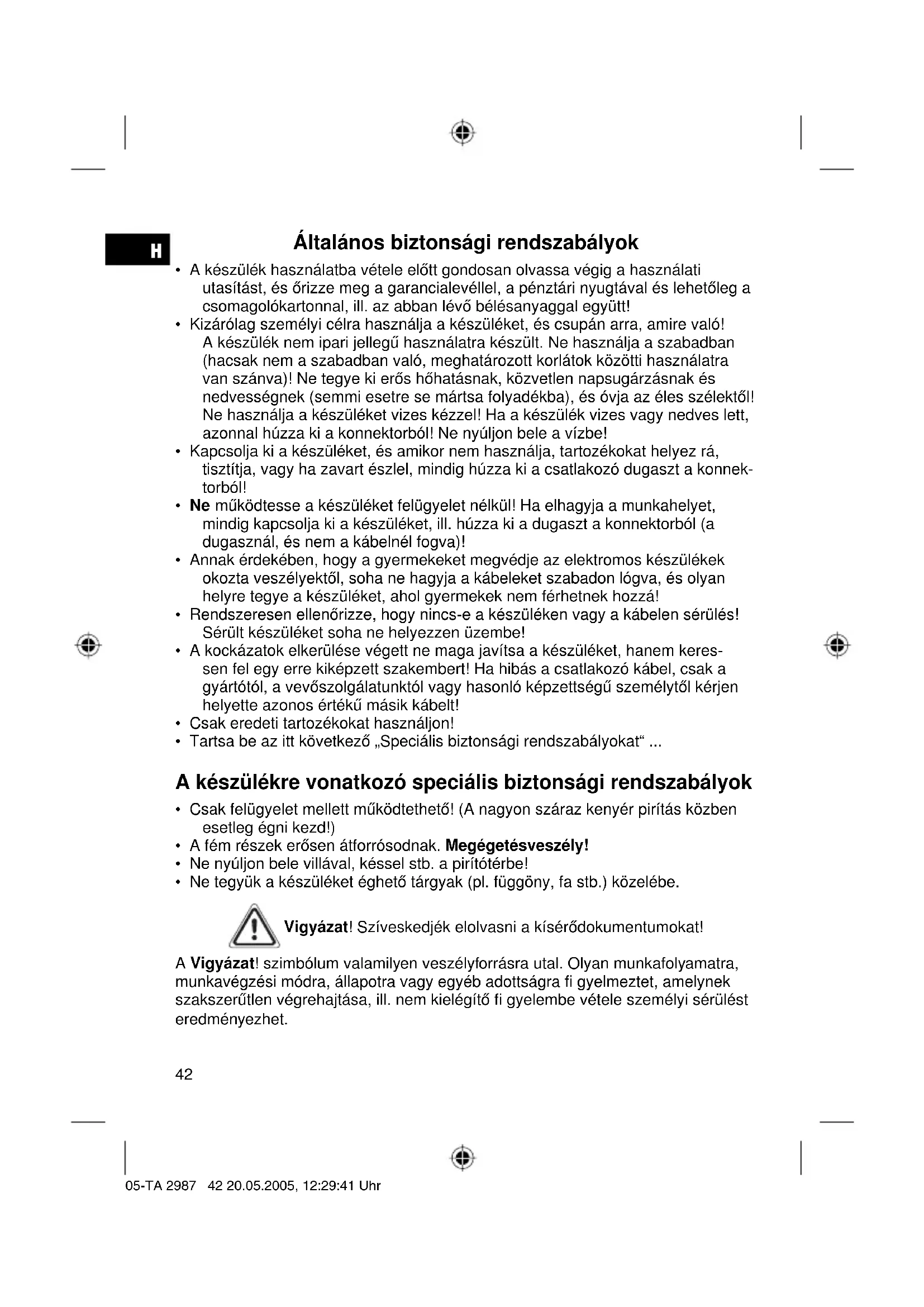 - Ne tegyük a készüléket éghető tárgyak (pl. függöny, fa stb.) közelébe. Vigyázat! Szíveskedjék elolvasni a kísérődokumentumokat! A Vigyázat! szimbólum valamilyen veszélyforrásra utal. Olyan munkafolyamatra, munkavégzési módra, állapotra vagy egyéb adottságra fi gyelmeztet, amelynek szakszerűtlen végrehajtása, ill. nem kielégítő fi gyelembe vétele személyi sérülést eredményezhet. 05-TA 2987 42 20.05.2005, 12:29:41 UhrH