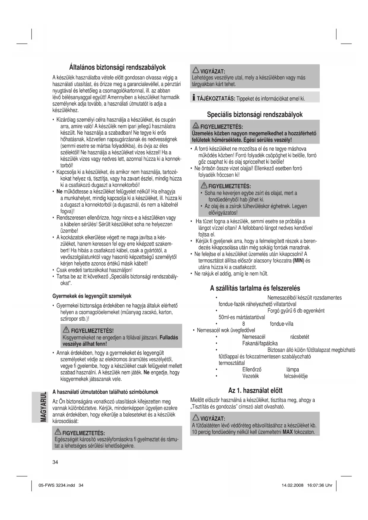 - Vezeték felcsévélője Az 1. használat előtt Mielőtt először használná a készüléket, tisztítsa meg, ahogy a „Tisztítás és gondozás” címszó alatt olvasható. VIGYÁZAT: A fűtőalátéten lévő védőréteg eltávolításához a készüléket kb. 10 percig fondüedény nélkül kell üzemeltetni MAX fokozaton. 05-FWS 3234.indd 3405-FWS 3234.indd 34 14.02.2008 16:07:36 Uhr14.02.2008 16:07:36 Uhr35 MAGYARUL MAGYARUL TÁJÉKOZTATÁS: Az enyhe füstfejlődés normális. Gondoskodjék megfelelő szellőztetésről! Használati útmutató