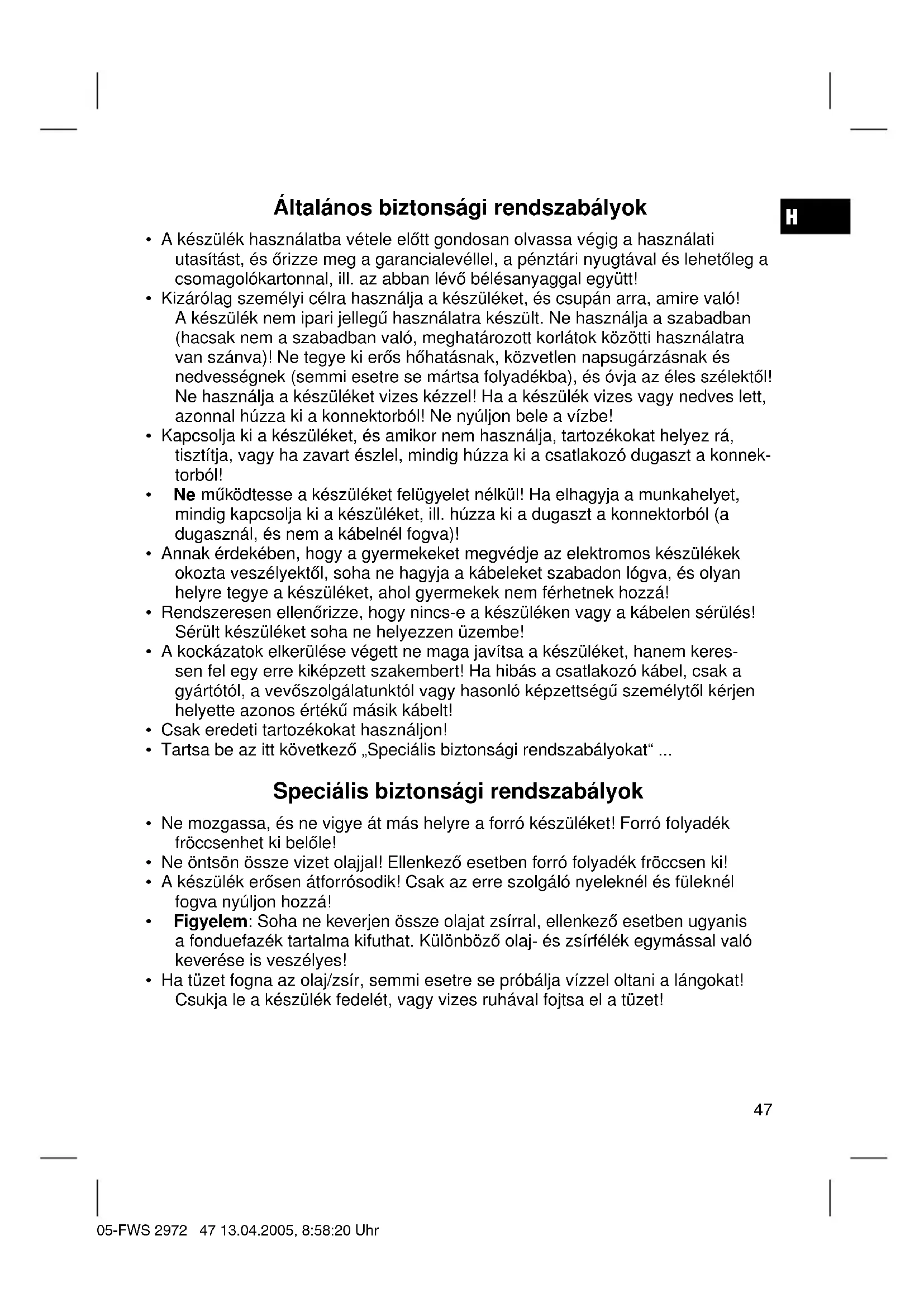 - Ha tüzet fogna az olaj/zsír, semmi esetre se próbálja vízzel oltani a lángokat! Csukja le a készülék fedelét, vagy vizes ruhával fojtsa el a tüzet! 05-FWS 2972 47 13.04.2005, 8:58:20 UhrH