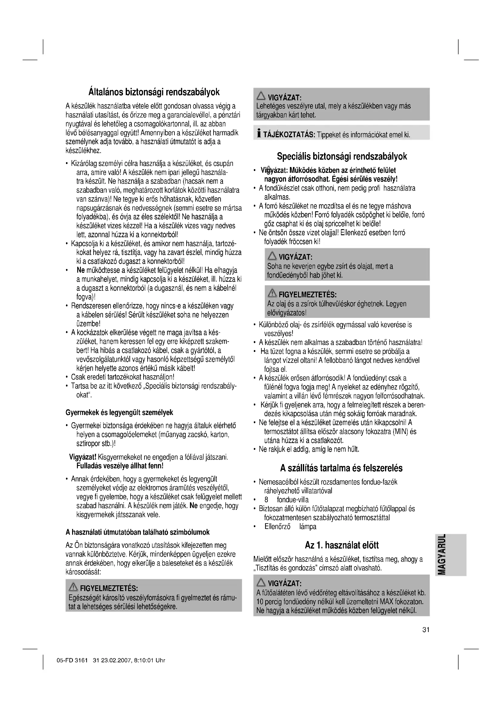 - Ellenőrző lámpa Az 1. használat előtt Mielőtt először használná a készüléket, tisztítsa meg, ahogy a „Tisztítás és gondozás” címszó alatt olvasható. VIGYÁZAT: A fűtőalátéten lévő védőréteg eltávolításához a készüléket kb. 10 percig fondüedény nélkül kell üzemeltetni MAX fokozaton. Ne hagyja a készüléket működés közben felügyelet nélkül. 05-FD 3161 31 23.02.2007, 8:10:01 Uhr32 MAGYARUL MAGYARUL TÁJÉKOZTATÁS: Az enyhe füstfejlődés normális. Gondoskodjék megfelelő szellőztetésről! Használati útmutató